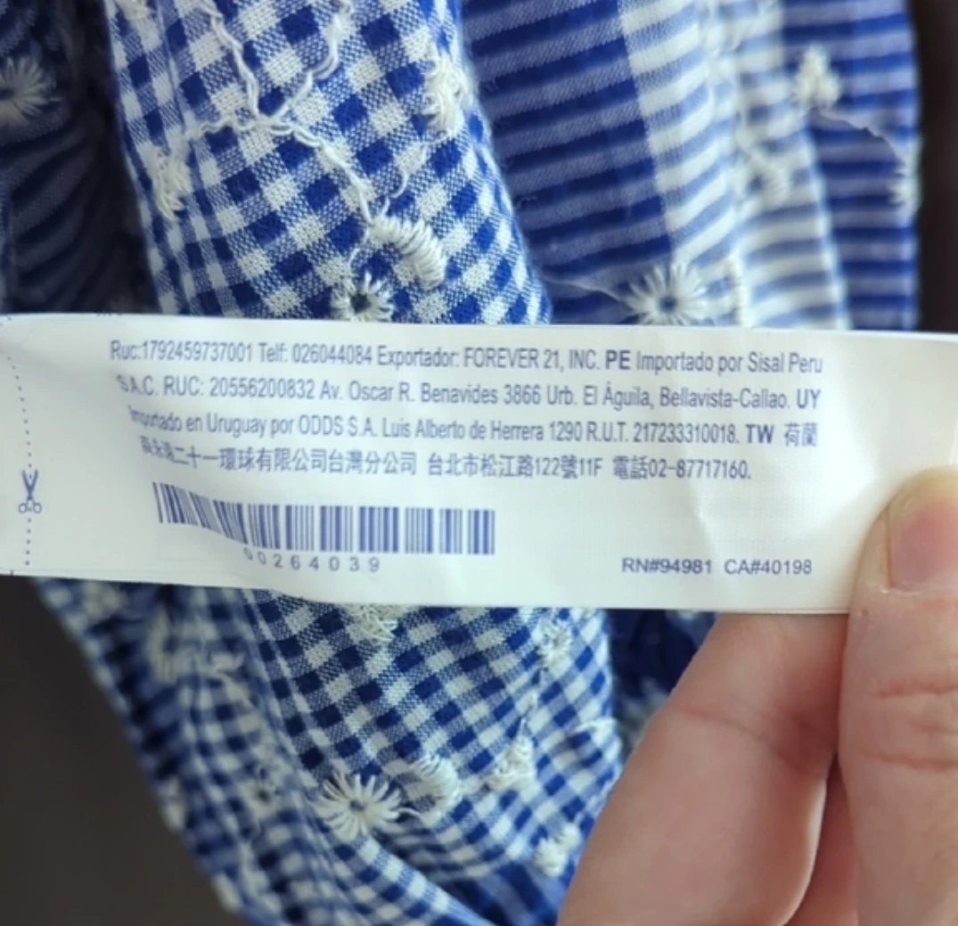 This cute off-the-shoulder crop top is from Forever 21. It's blue and white with a checkered and floral print. The top is a size small.