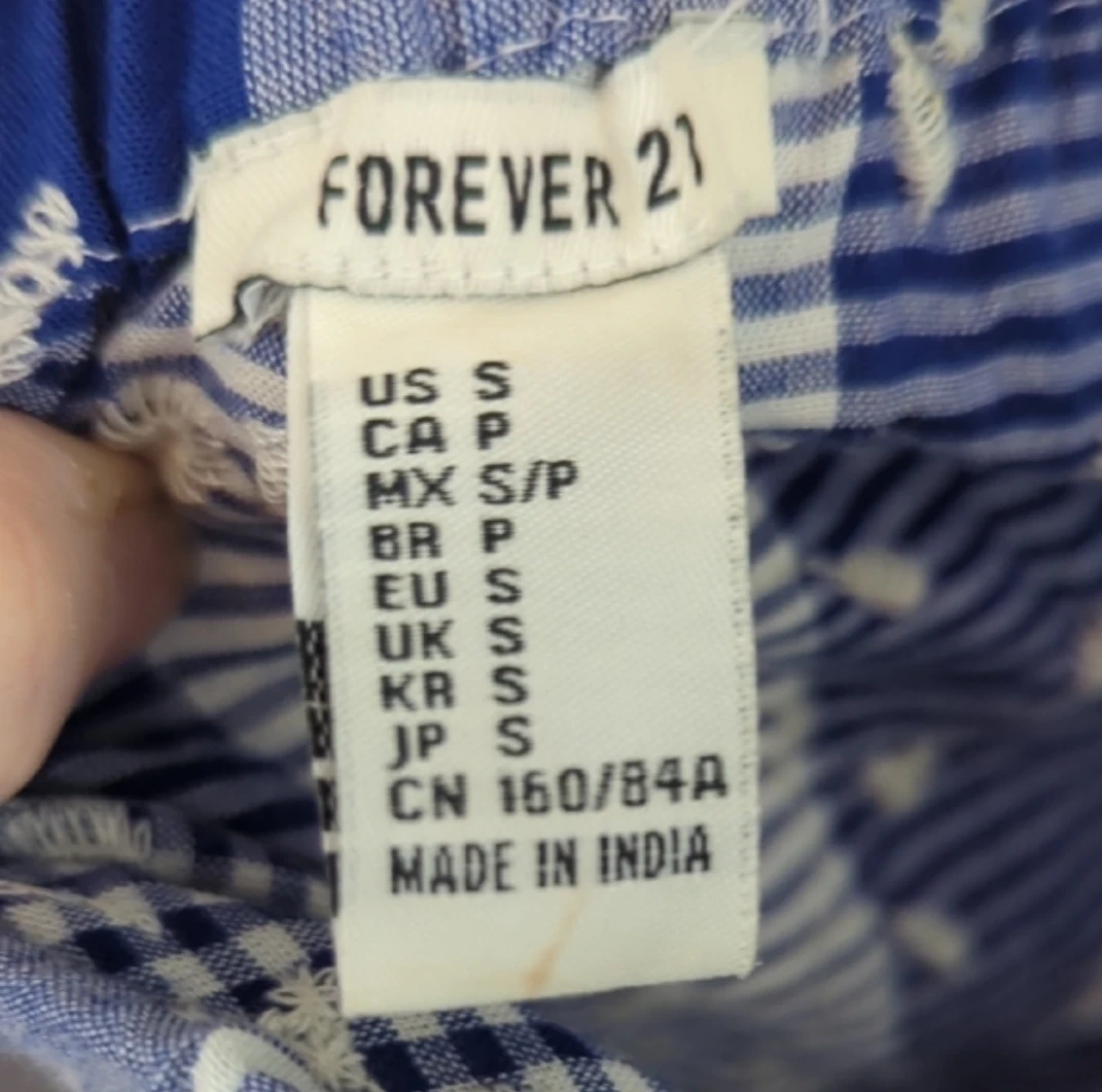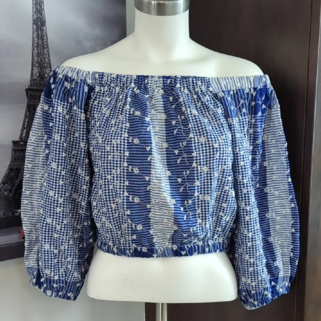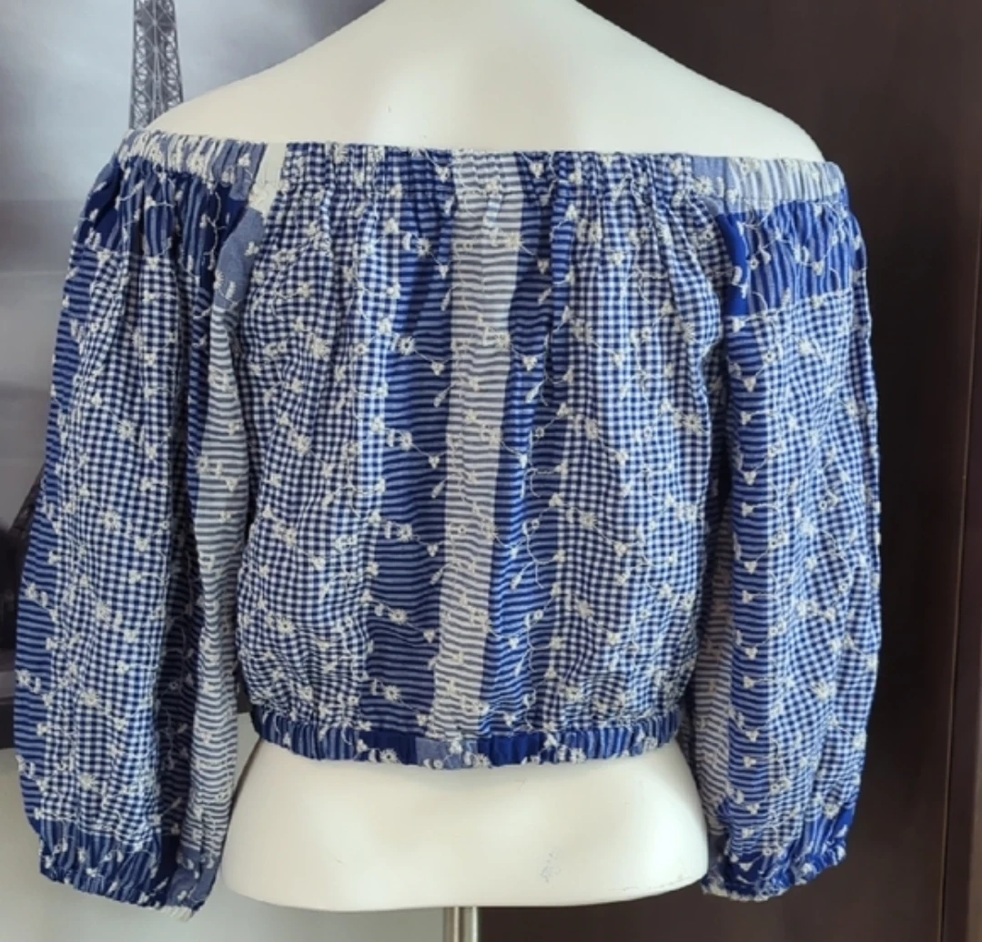 This cute off-the-shoulder crop top is from Forever 21. It's blue and white with a checkered and floral print. The top is a size small.
