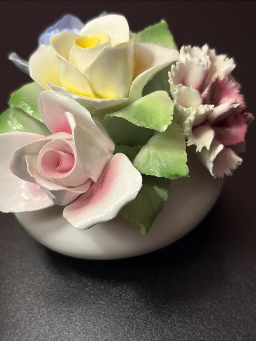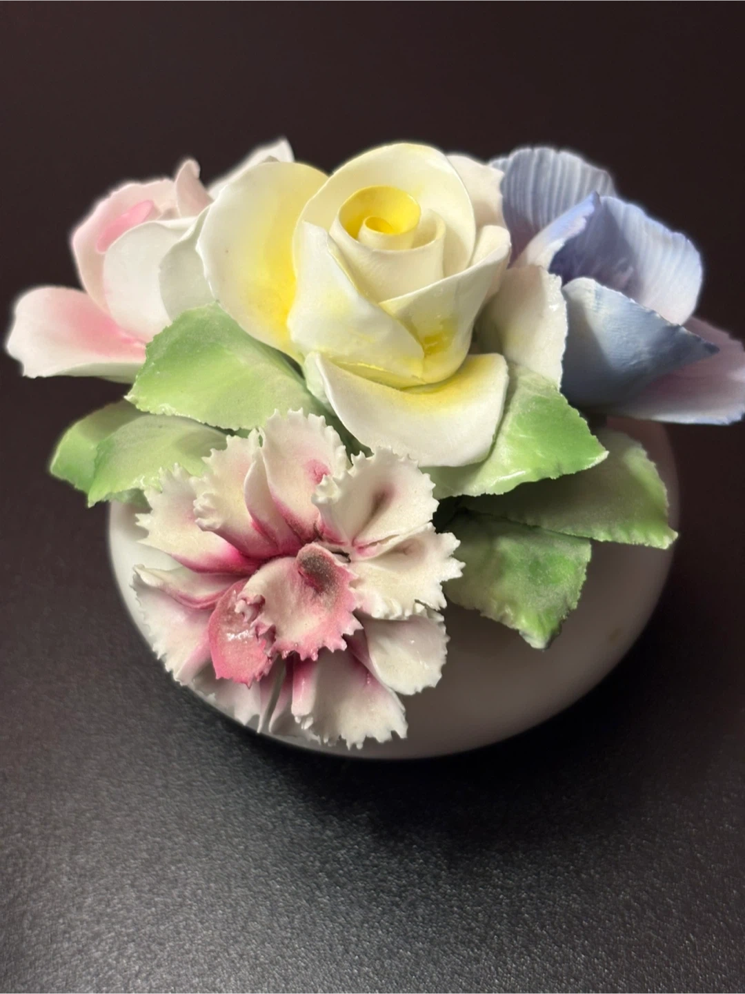 A lovely porcelain flower arrangement handmade in Staffordshire, England. Crafted from English fine bone china, it features a colourful mix of roses and carnations. Adds a touch of elegance to any space!