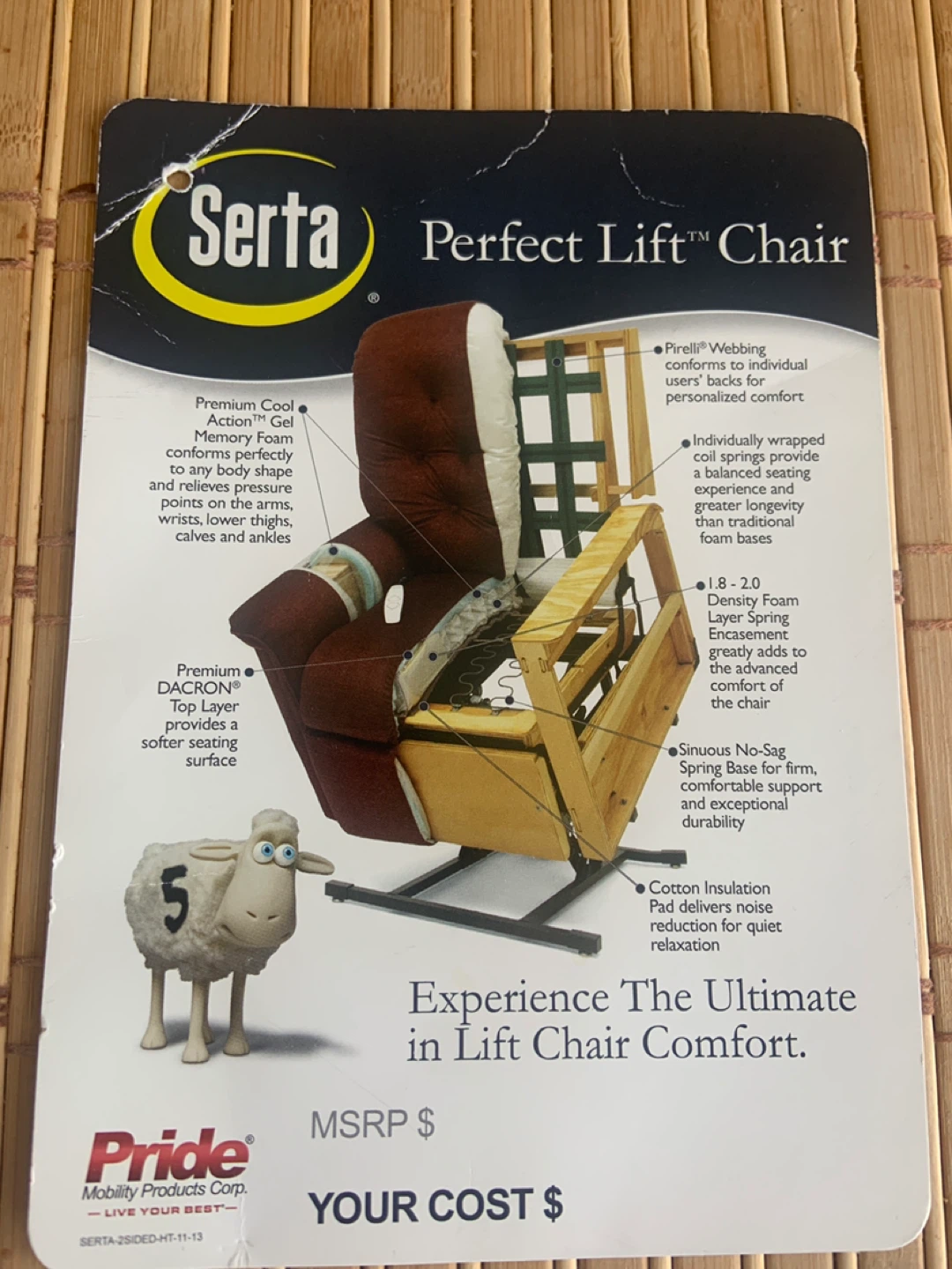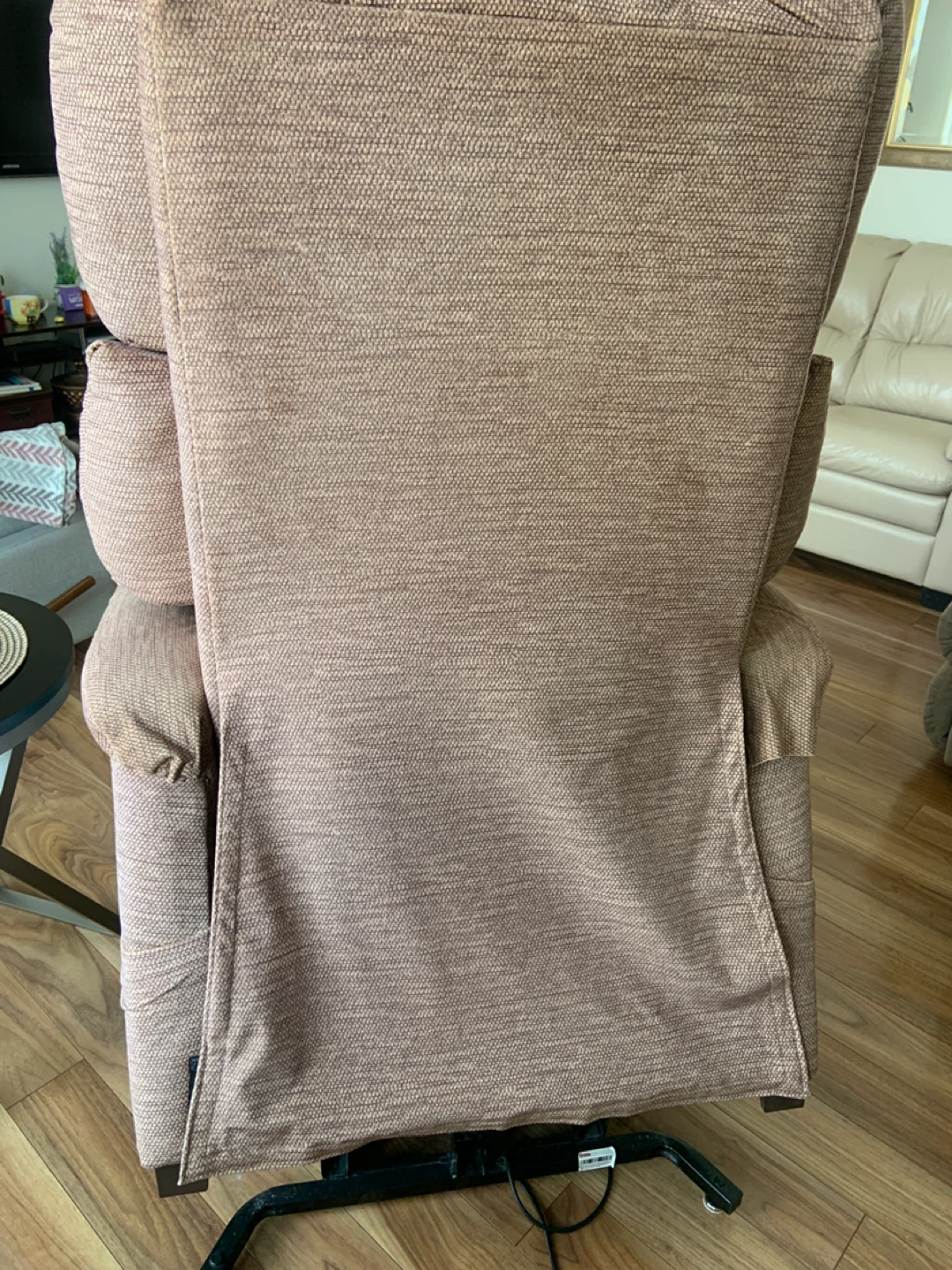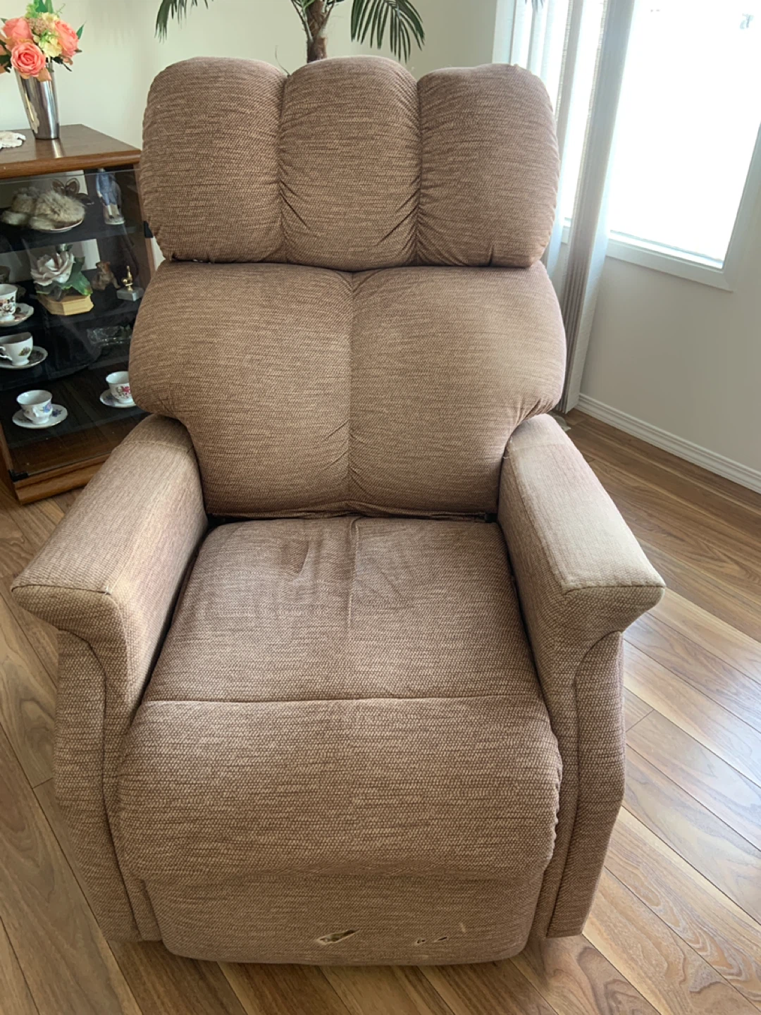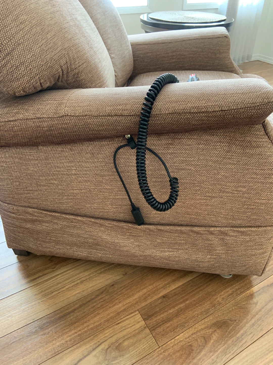 Comfortable Pride lift recliner in a neutral brown fabric. It has a wired remote for easy operation of the lift and recline functions. The chair is in good working order, though there is some wear on the footrest.