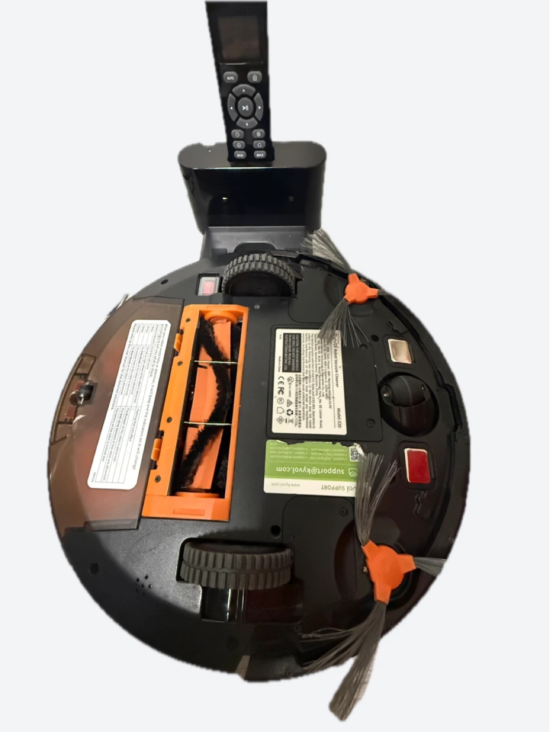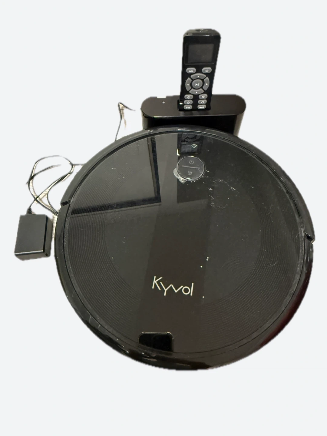 Handy Kyvol E20 robot vacuum. Comes with the charging dock and remote control. Great for keeping floors clean. It's got super strong suction power! Selling because no longer using it. Glass came broken near button but does not affect vacuum.