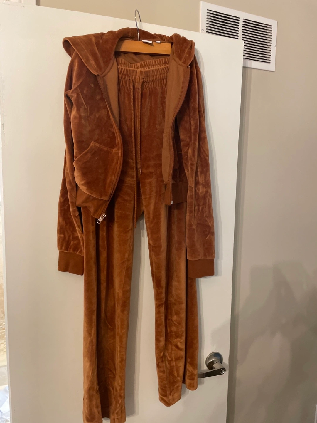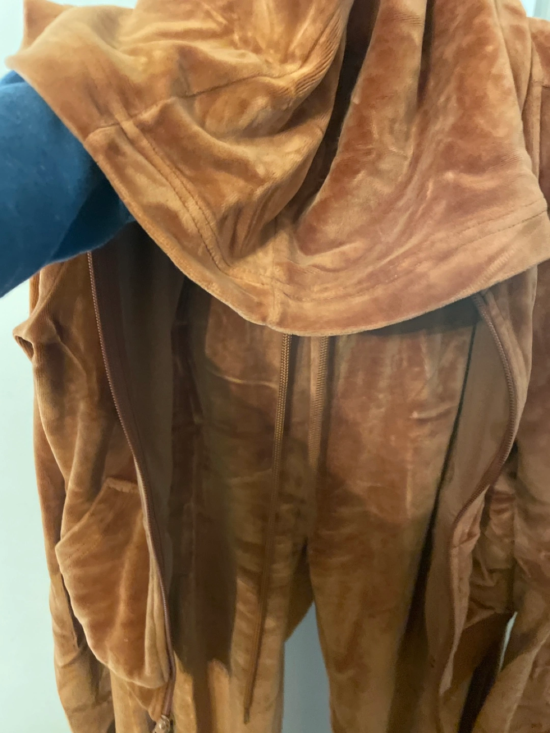 Brown velour tracksuit. Size small. Long pants with elastic waistband and drawstring. Zippered jacket with hood. Barely worn - wrong colour for me.