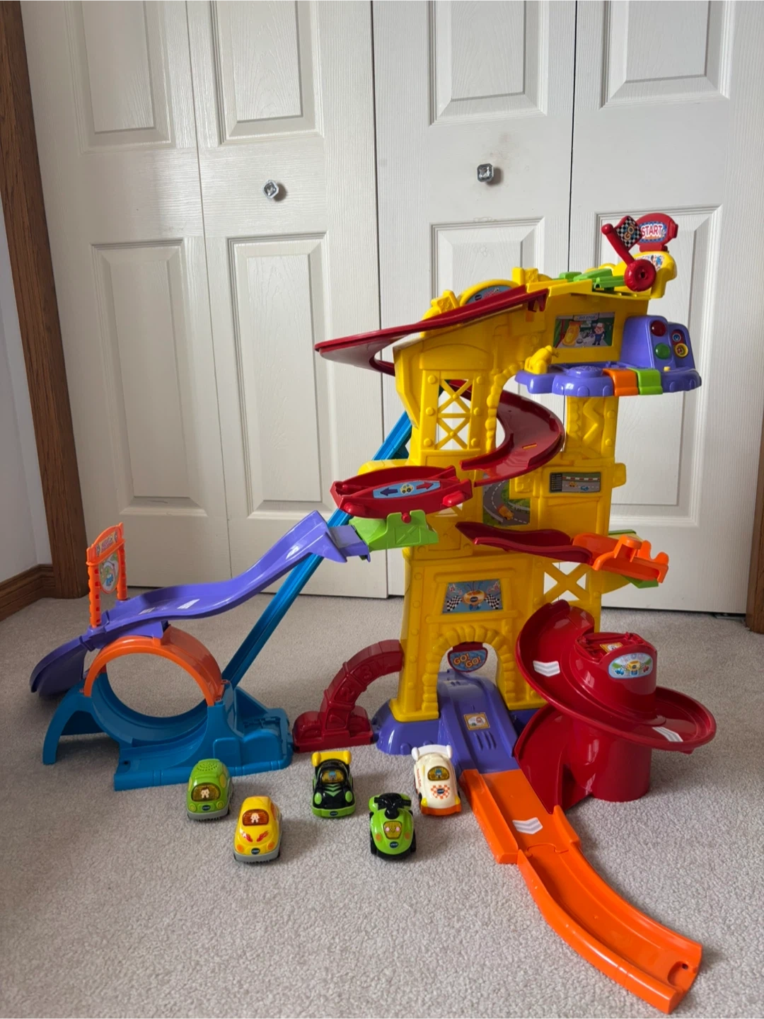 This VTech Go! Go! Smart Wheels playset is a fun race track with multiple levels. It includes several small vehicles that trigger fun sounds and phrases when they roll over the SmartPoints. Perfect for little race car enthusiasts!
