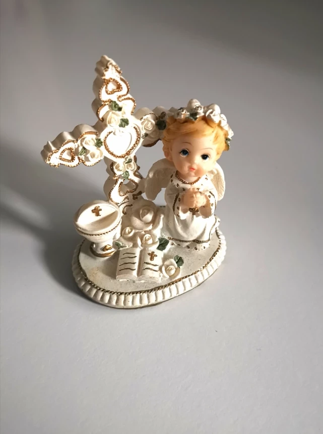 Small, white, praying angel figurine with a cross and chalice. very cute gift.
