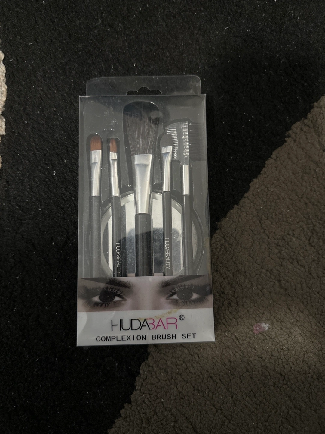 Five-piece brush set. Includes powder brush, two angled brushes, and two smaller brushes. Comes with a small mirror. New, in packaging. Never used.