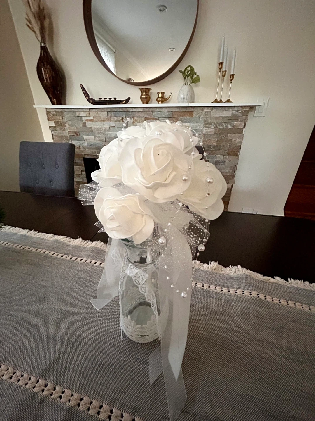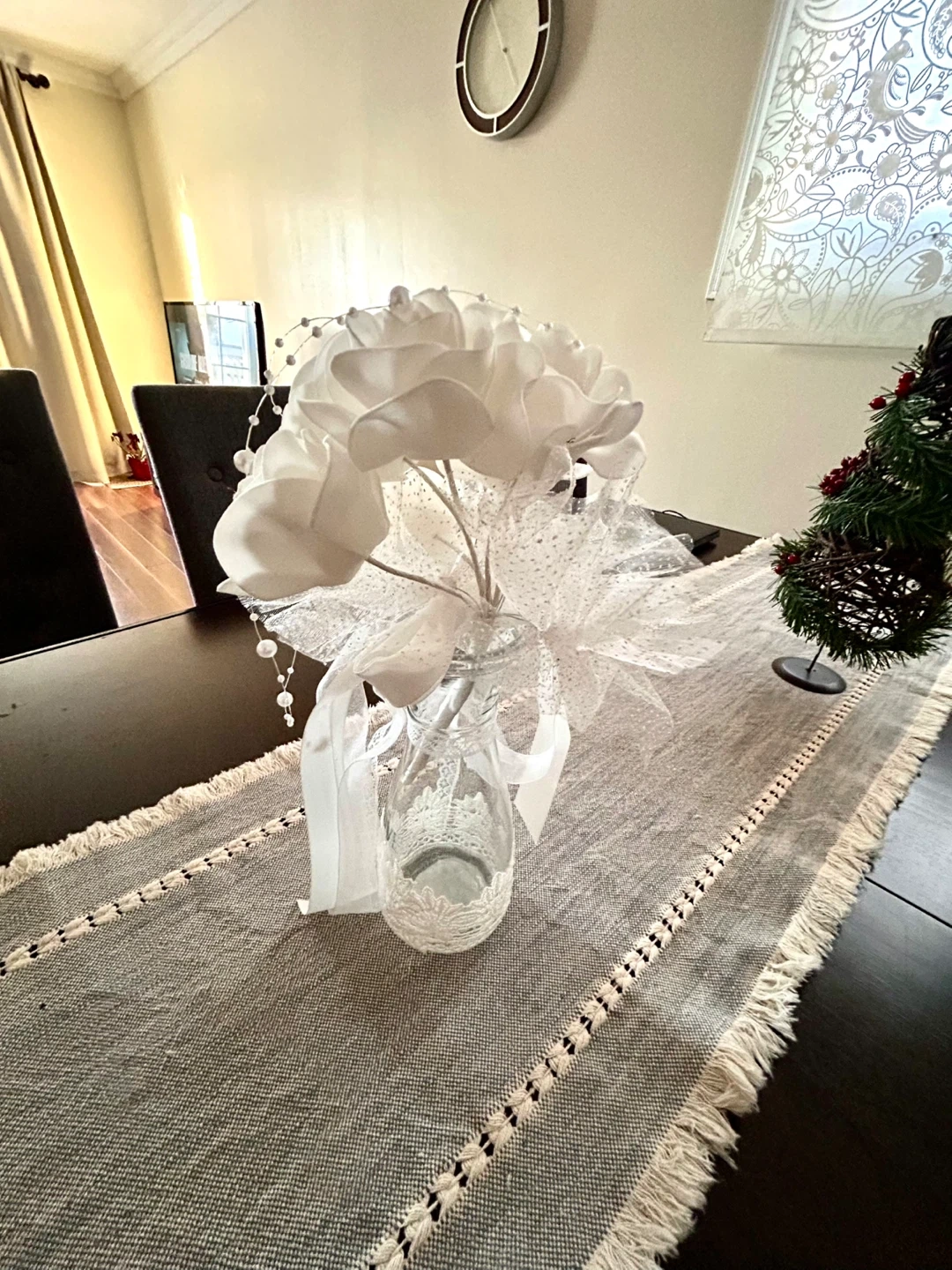 A lovely white floral arrangement in a decorated glass vase. It's adorned with ribbons and faux pearls. This piece would make a beautiful centrepiece for a table or mantle.