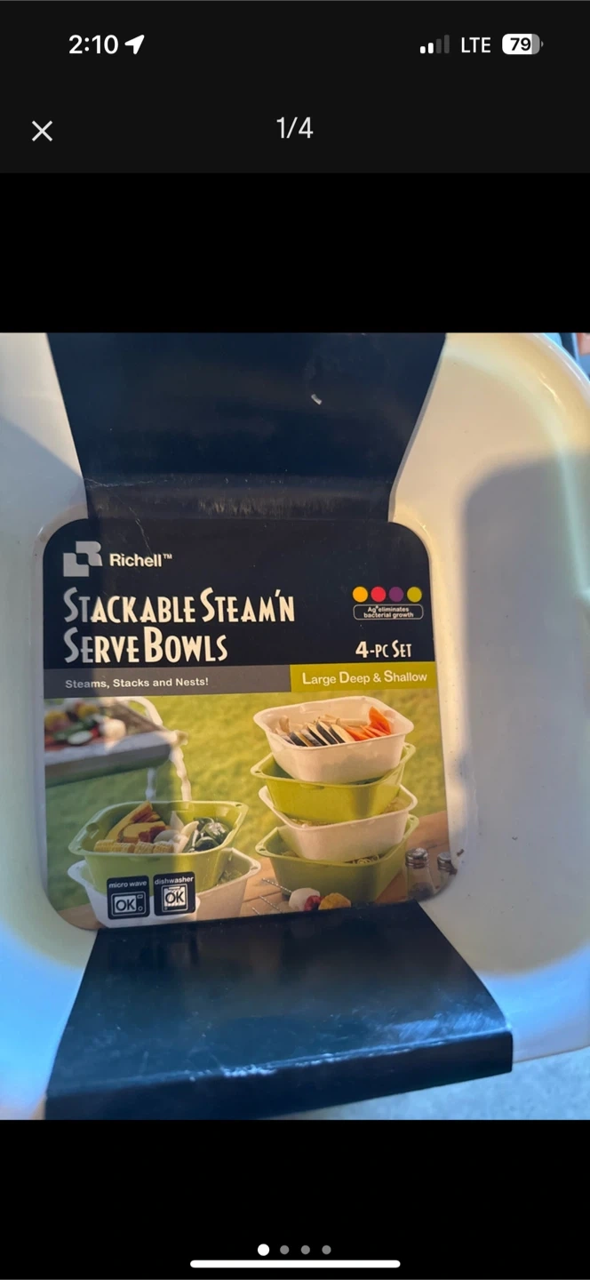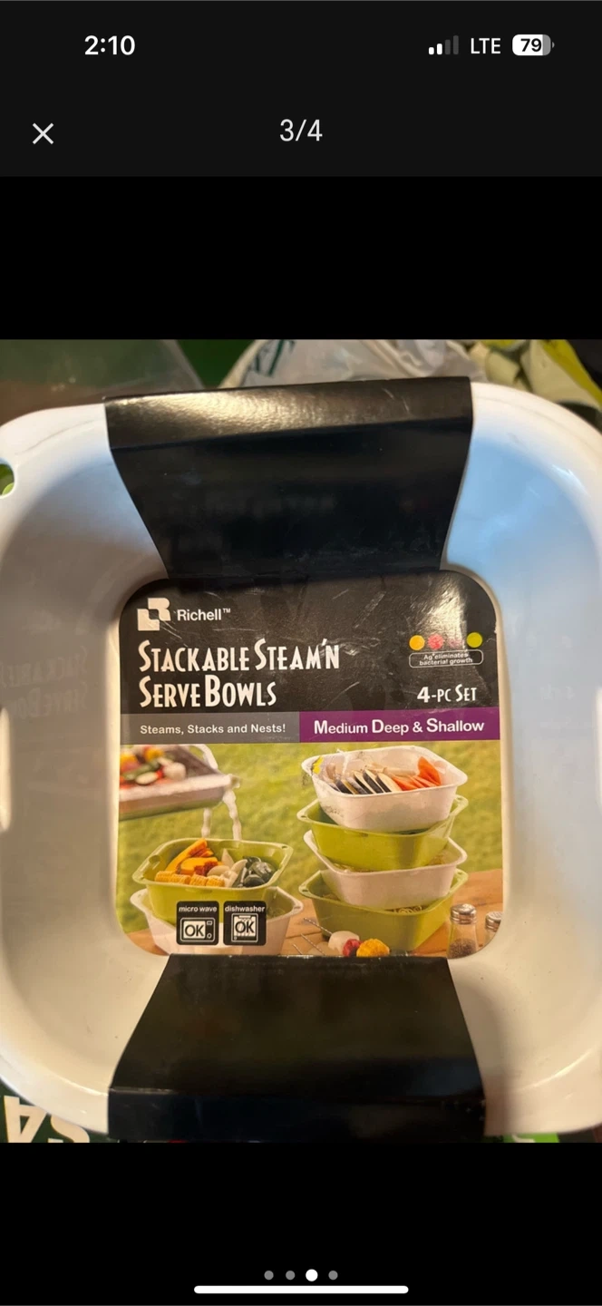 Selling a set of Richelle Stackable Steam'n Serve Bowls. These are a 4-piece set designed to steam, stack, and nest! They're perfect for steaming in the microwave, using as a colander, and draining hot water. Great for larger food portions too