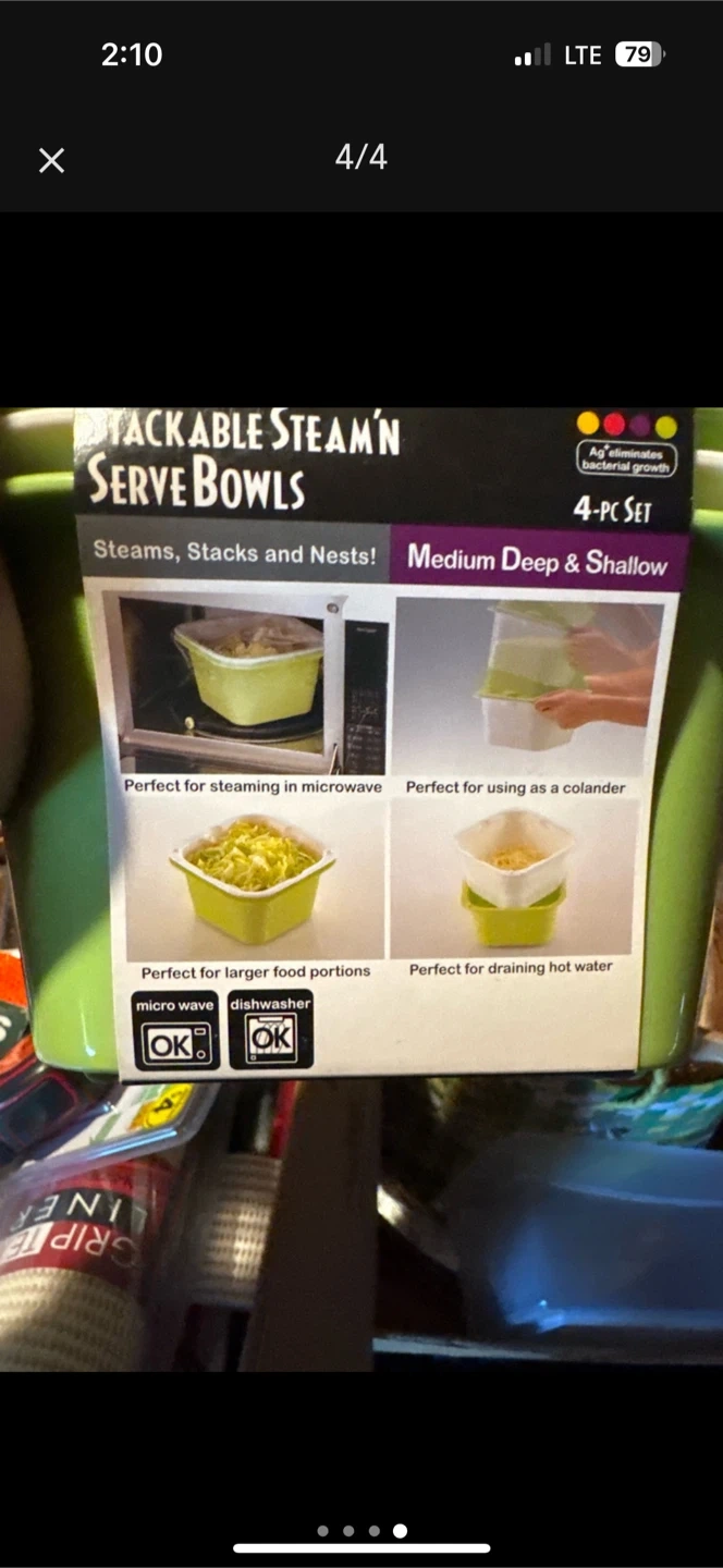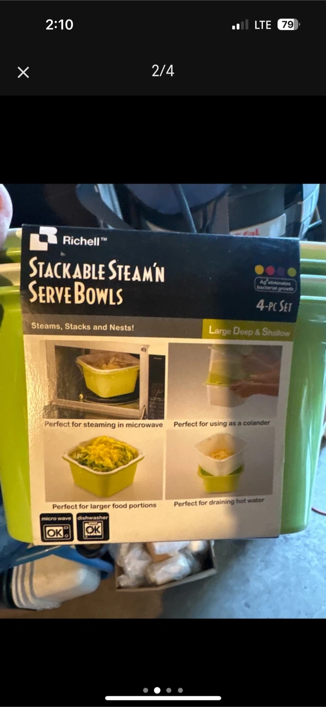 Selling a set of Richelle Stackable Steam'n Serve Bowls. These are a 4-piece set designed to steam, stack, and nest! They're perfect for steaming in the microwave, using as a colander, and draining hot water. Great for larger food portions too