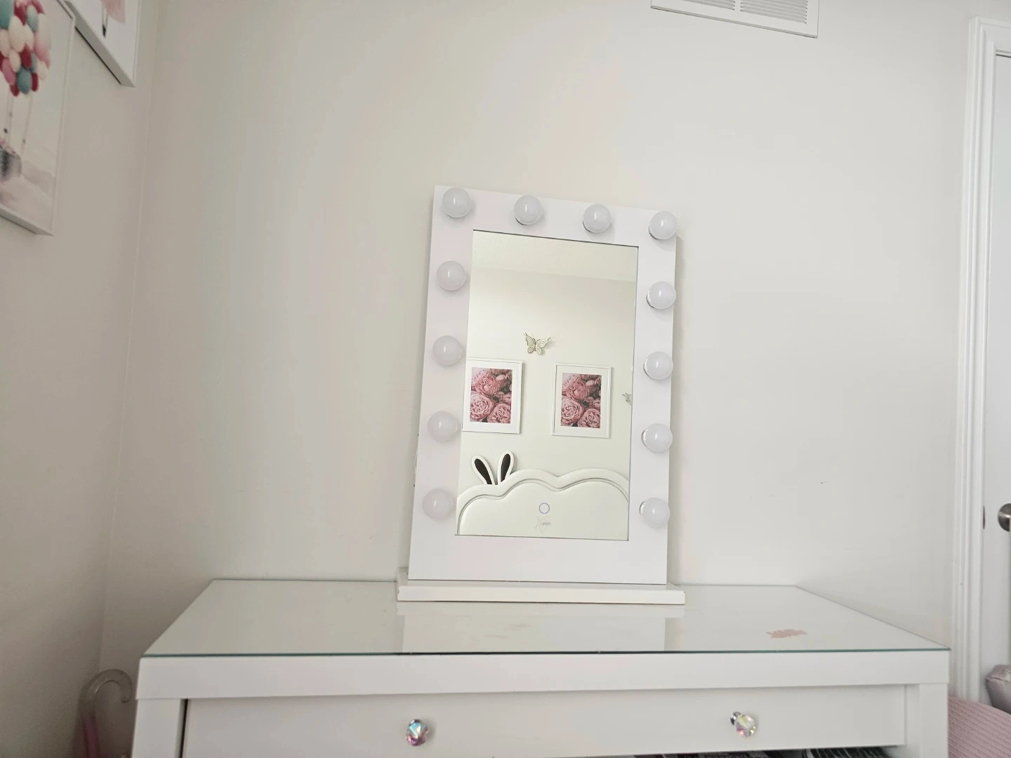 White vanity and mirror with 10 LED bulbs. It has a simple on/off switch. This mirror is great for makeup application.