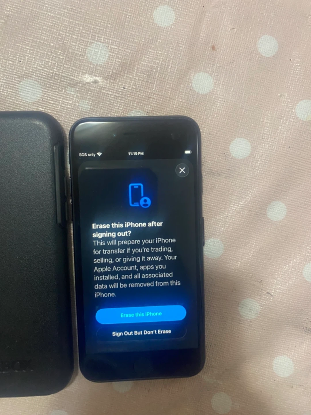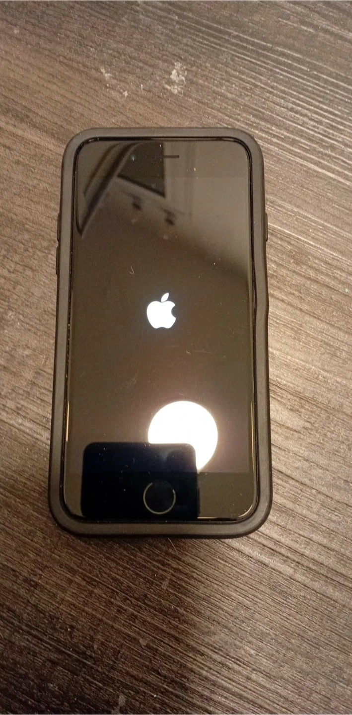 Black iPhone with a black OtterBox case. This phone has been factory reset and is ready for a new owner. It's in good working condition.