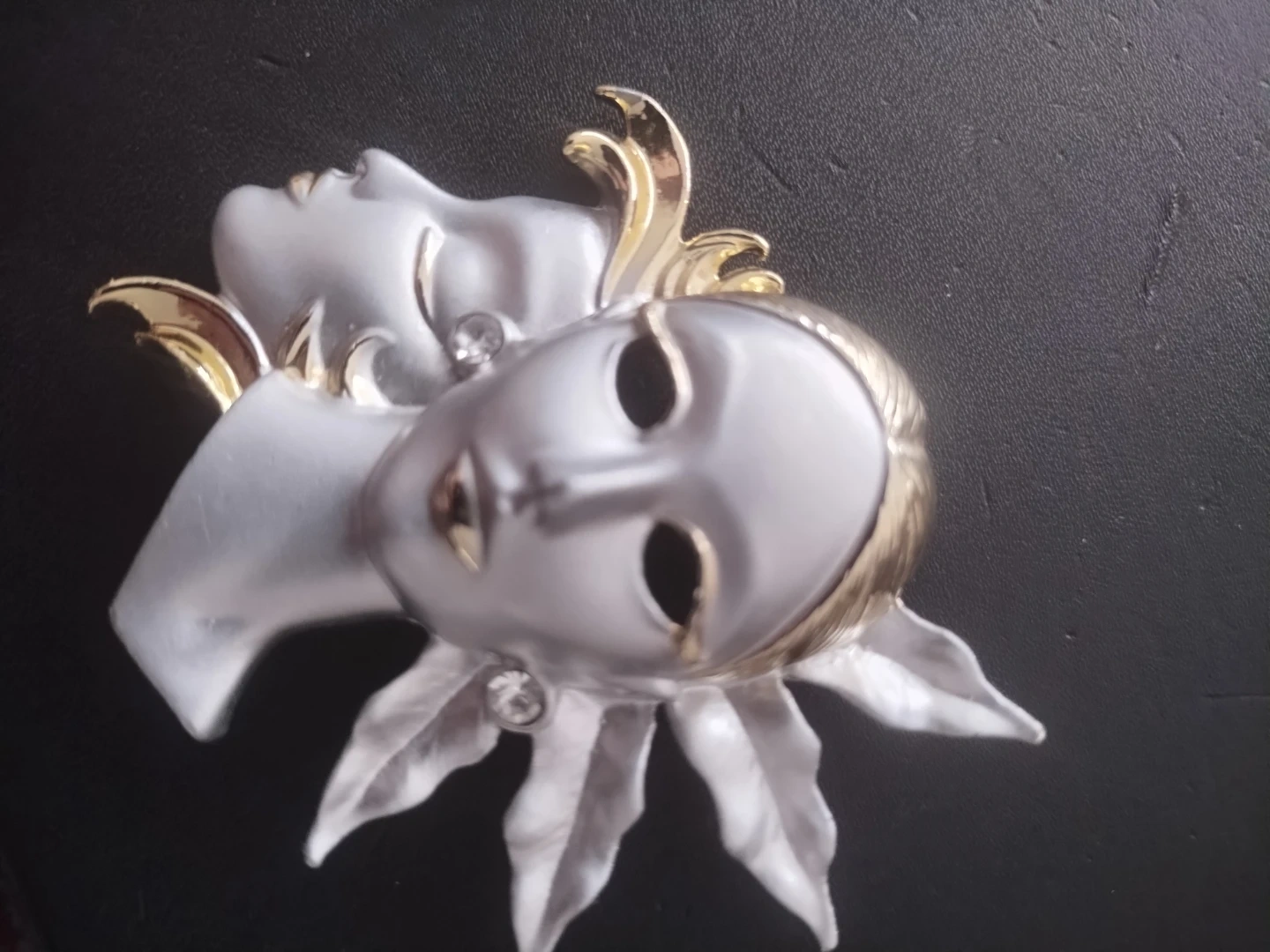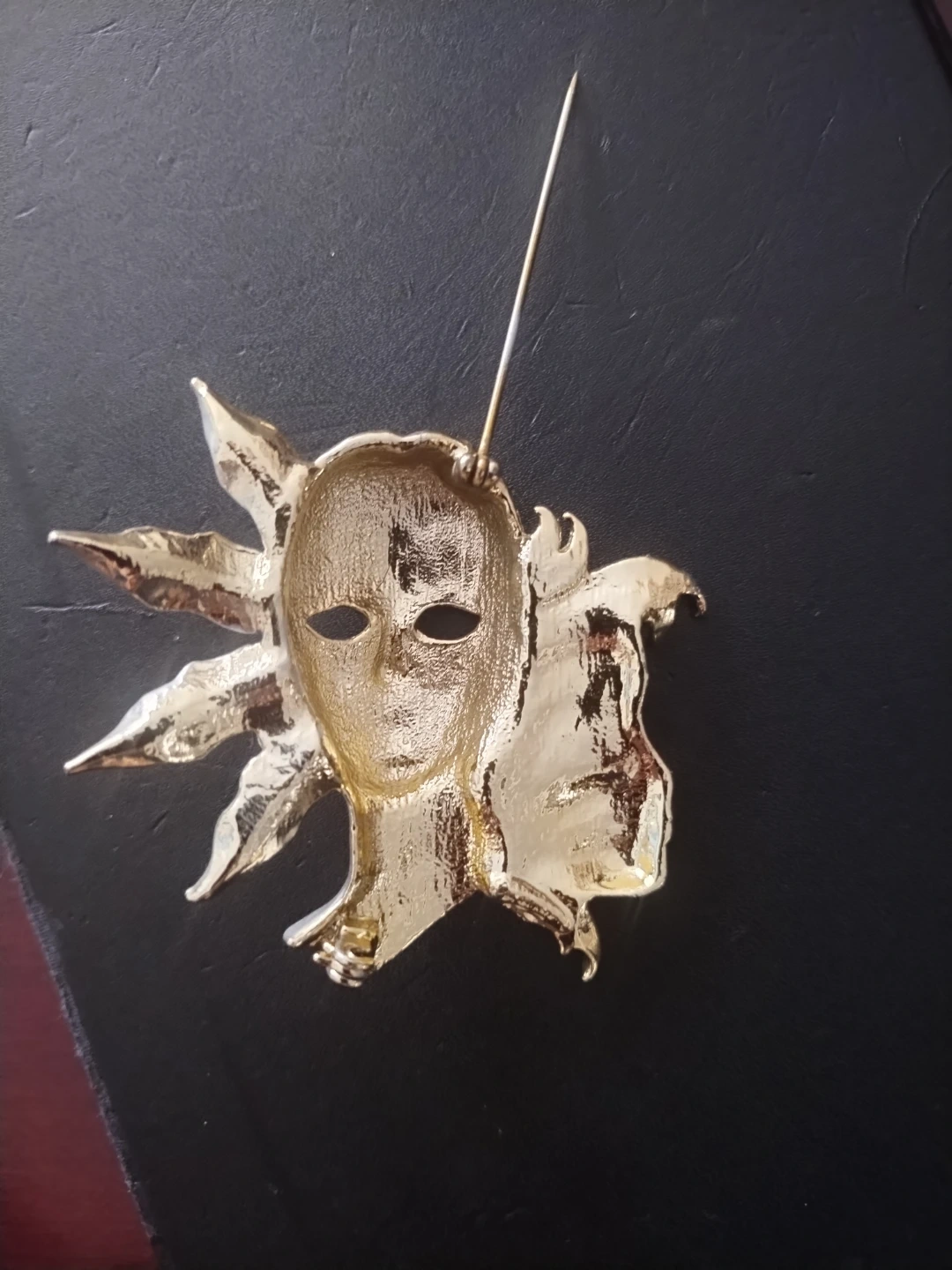 This vintage brooch features a unique masquerade mask design with dual faces. It's crafted from mixed metals with a gold-tone finish and accented with clear rhinestones. A stylish accessory for any occasion!
