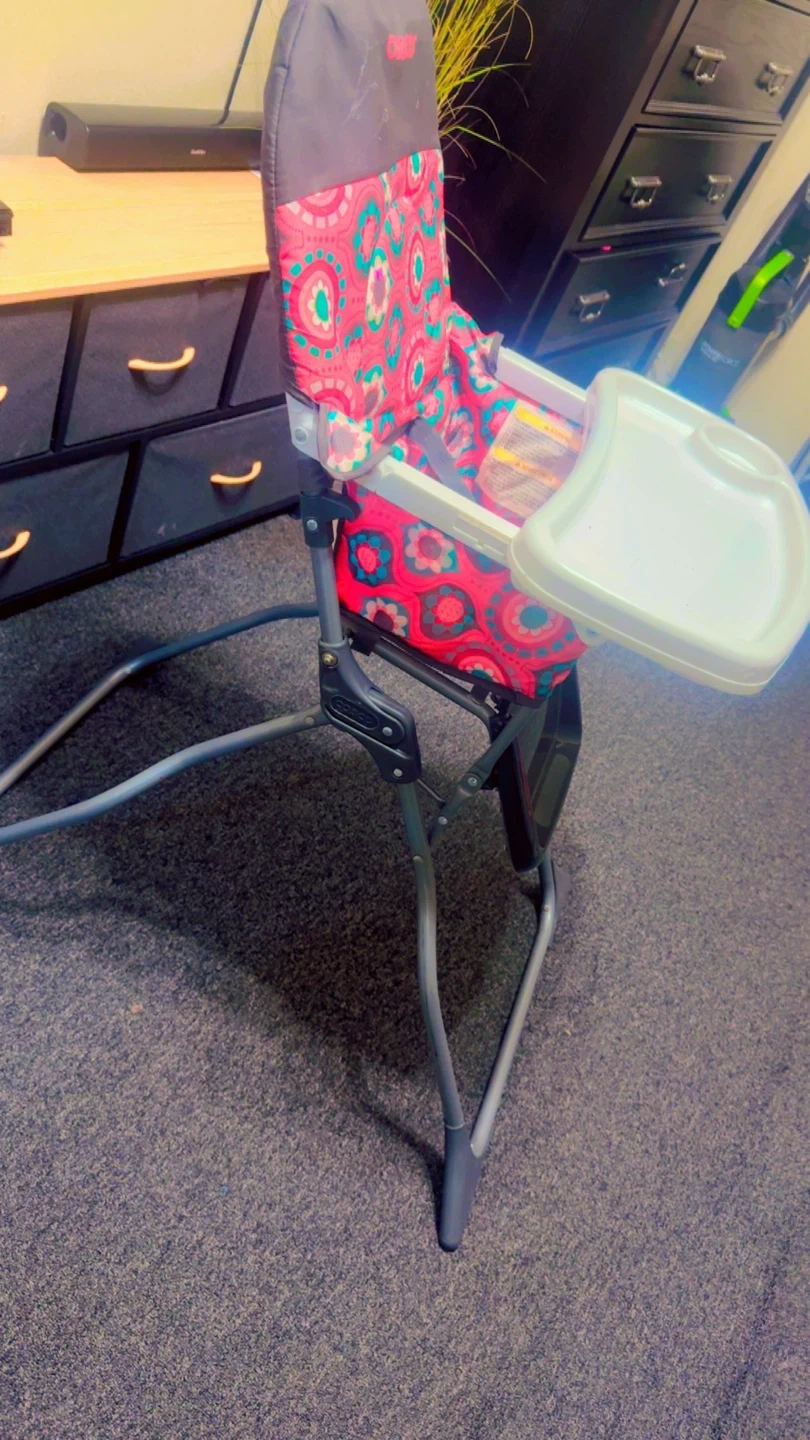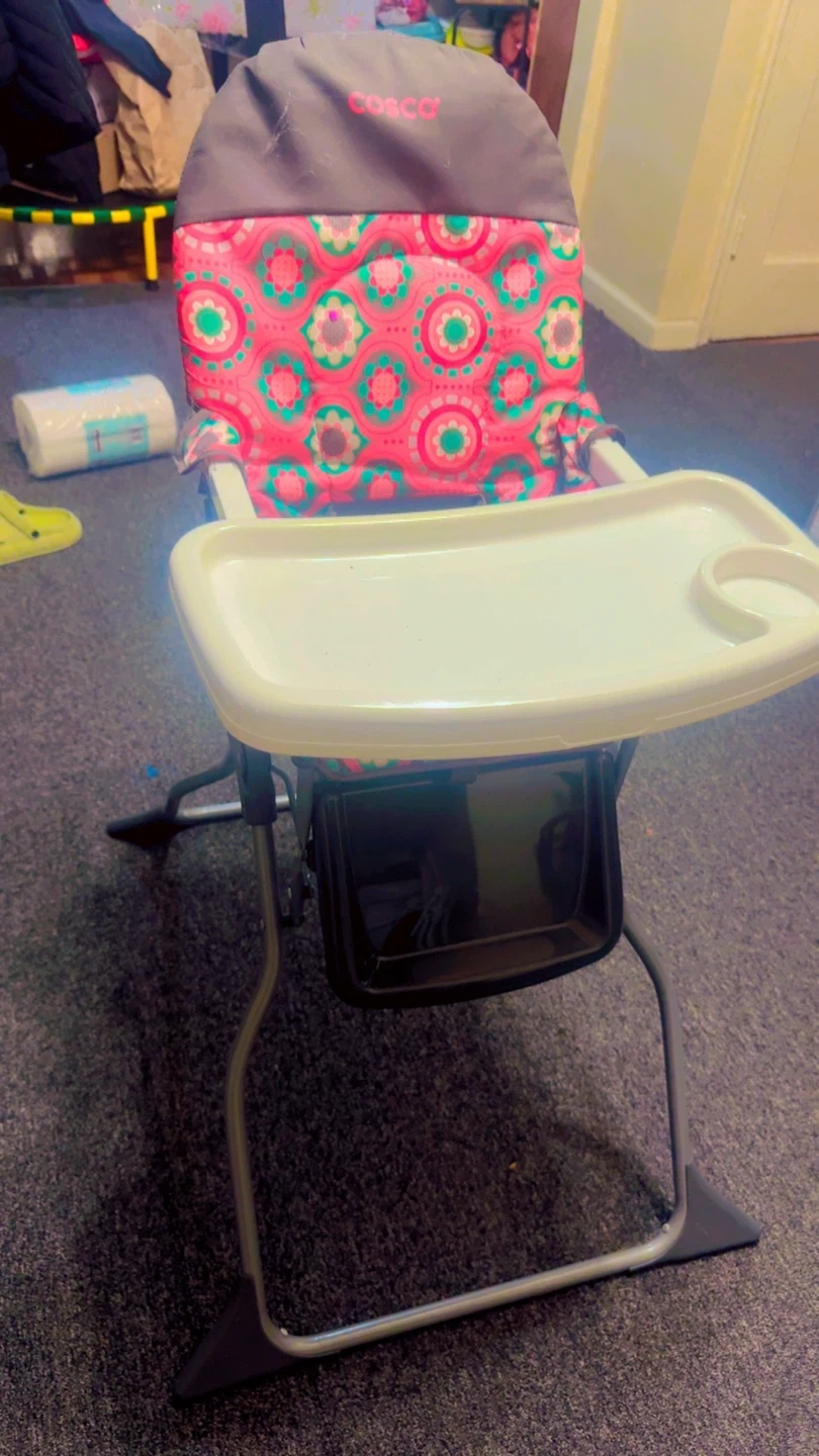 This Cosco high chair features a fun floral pattern. It's in good condition and ready for a new home! Perfect for meal times with your little one