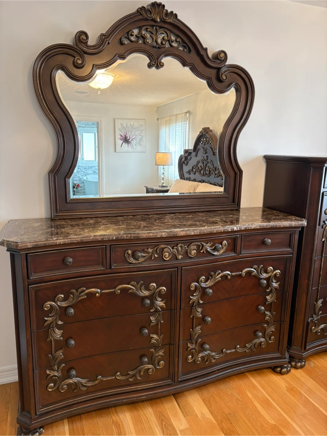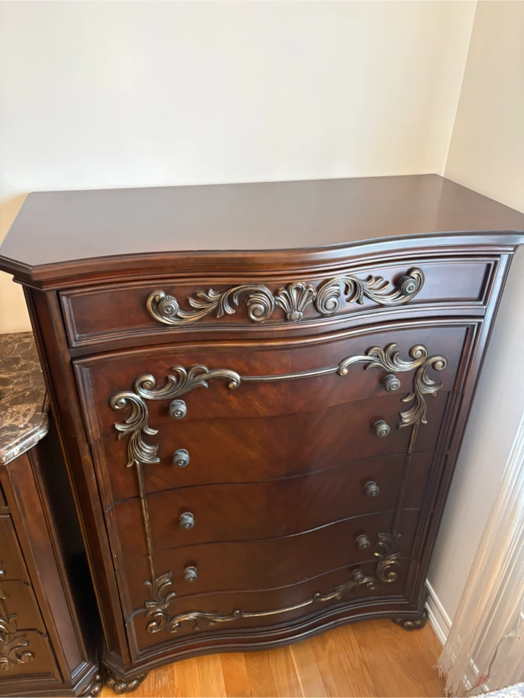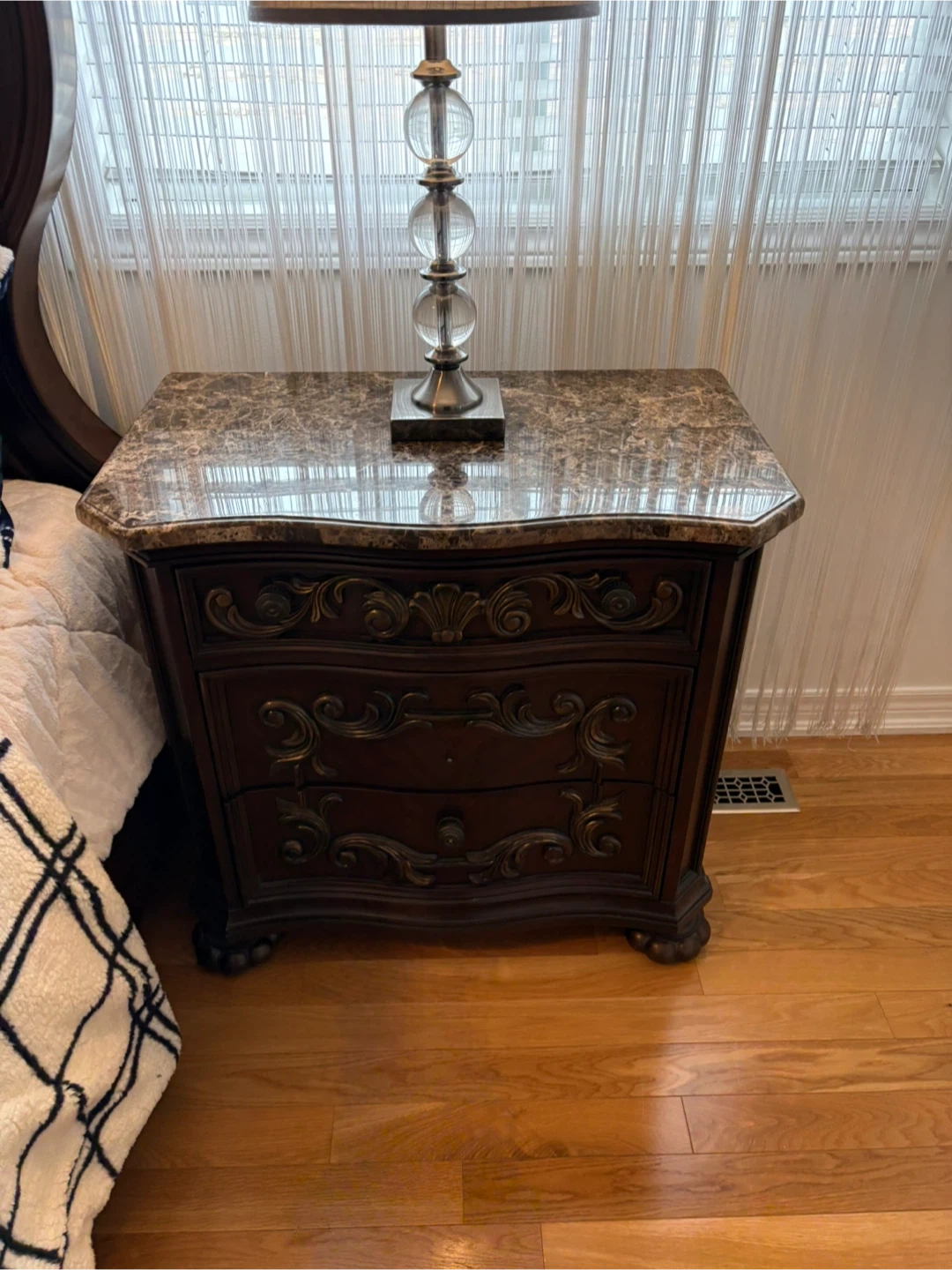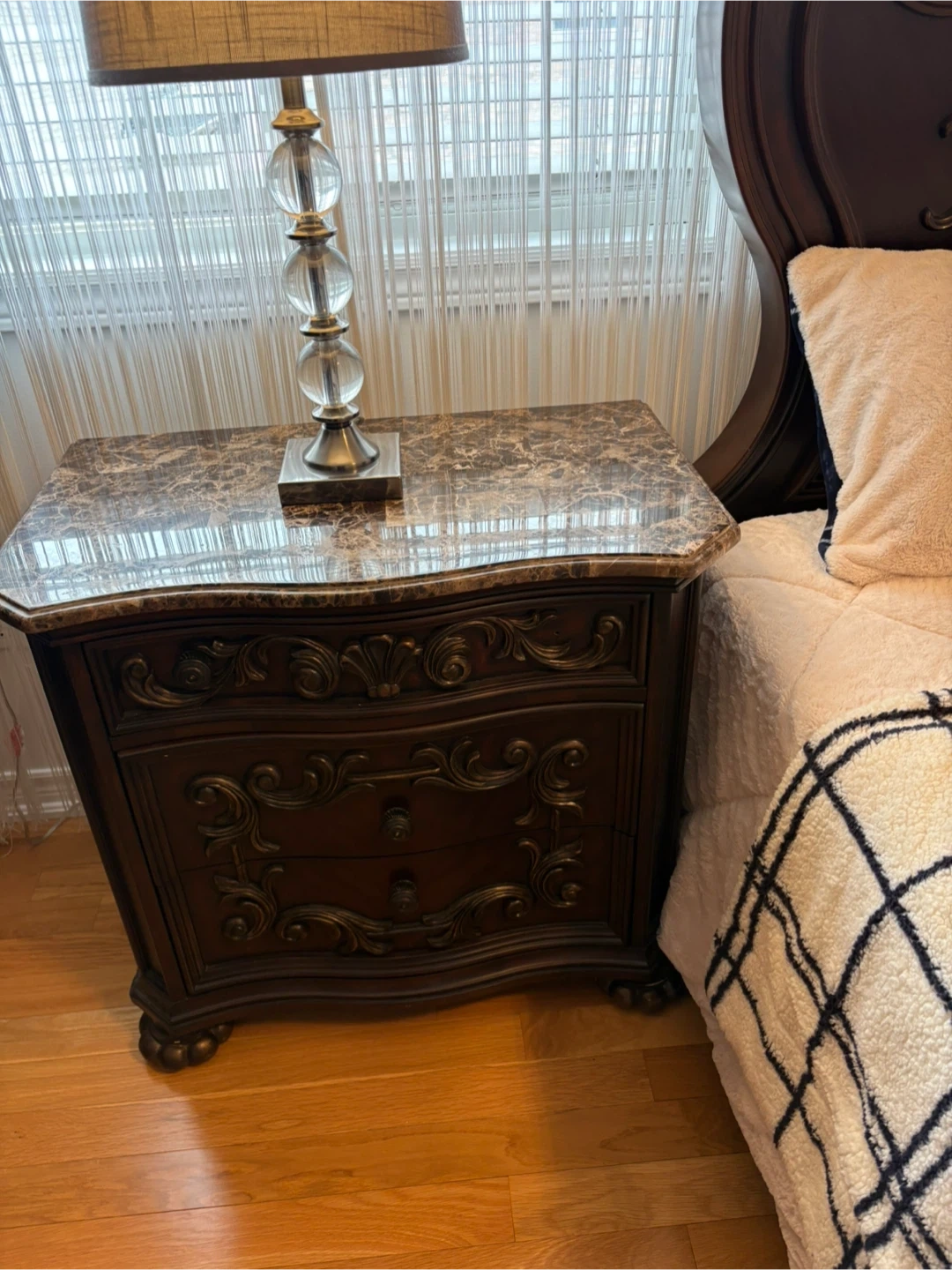 This is a dark wood nightstand featuring an ornate design and a marble top. It has three drawers for storage. This piece would complement a traditional bedroom set.