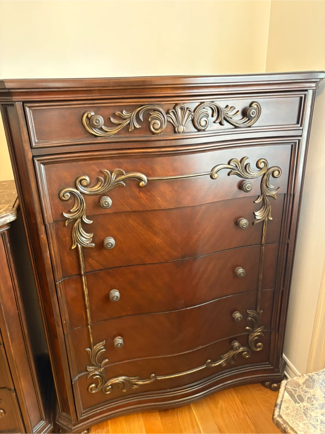 This is a dark wood nightstand featuring an ornate design and a marble top. It has three drawers for storage. This piece would complement a traditional bedroom set.