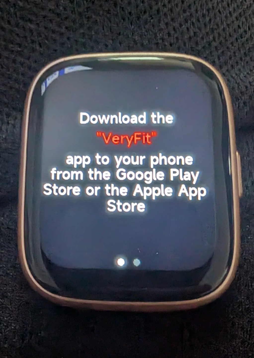 This is a smart watch with a rose gold coloured casing. It comes with two straps and a USB charging cable. The watch displays "Download the "VeryFit" app to your phone from the Google Play Store or the Apple App Store" on startup. It's a sports partner.