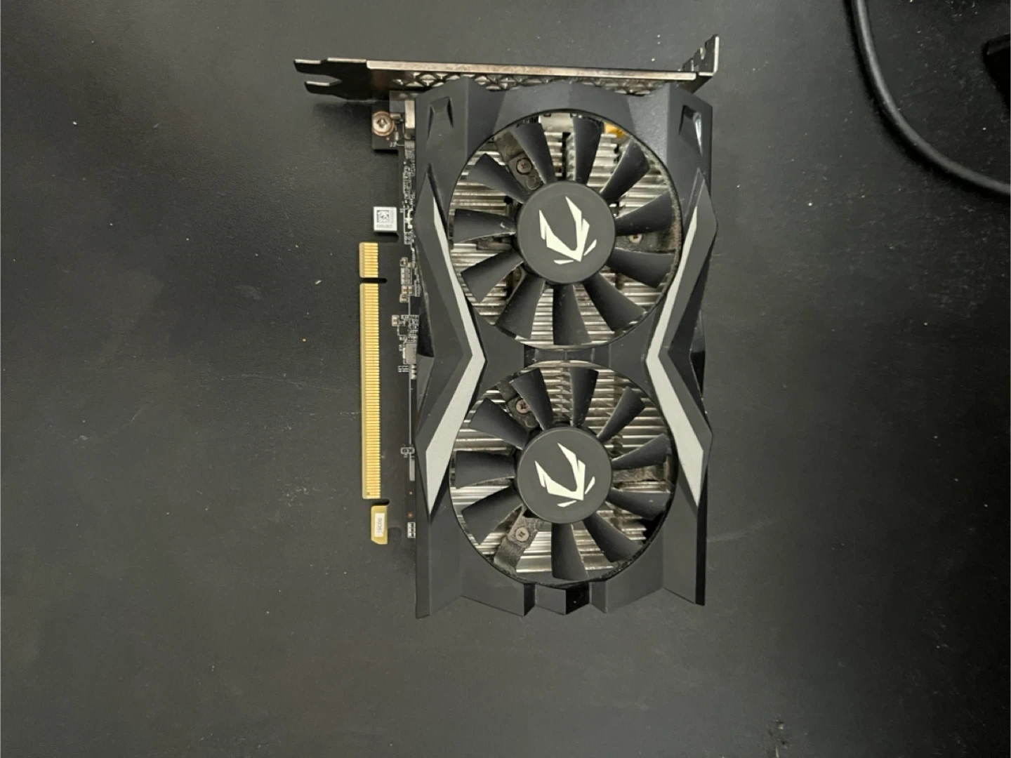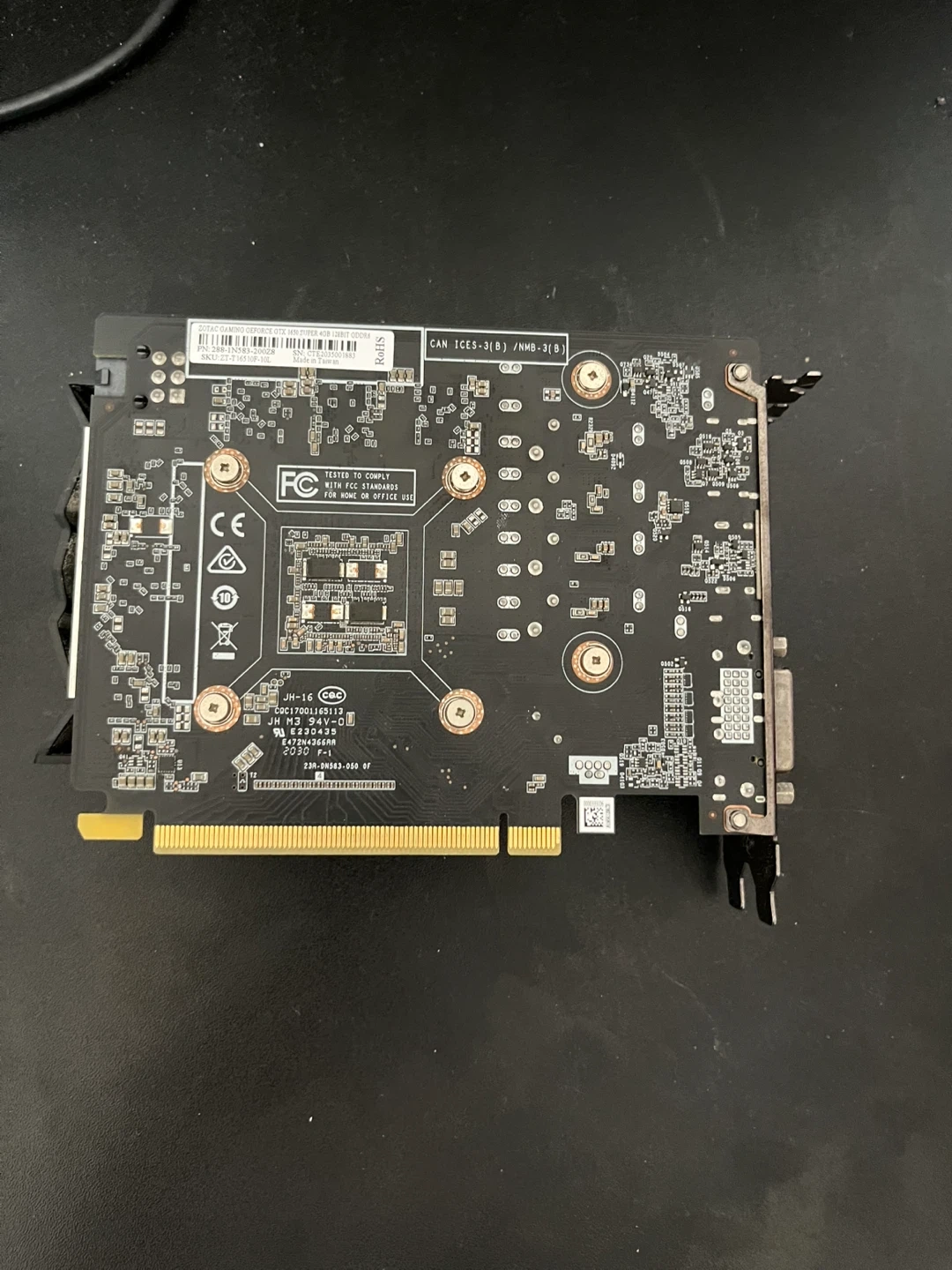This is a Zotac Gaming GeForce GTX 1650 Super graphics card. It comes with 4GB of GDDR6 memory and a 128-bit memory interface. The card features two cooling fans and outputs including HDMI, DisplayPort, and DVI-D.