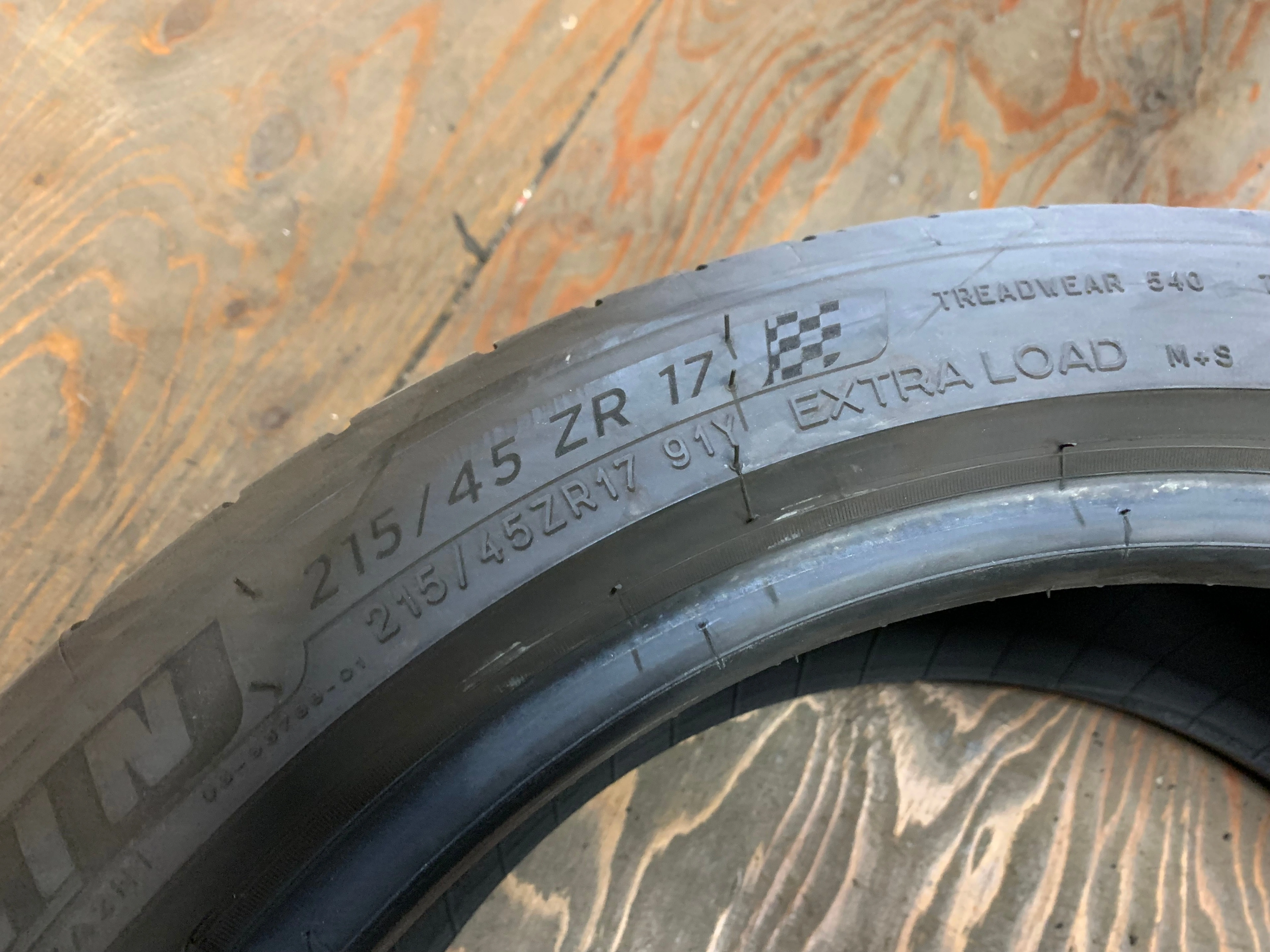 size 215/45/17 91Y XL M+S Michelin Pilot AS4 with no repairs and 80/90% tread