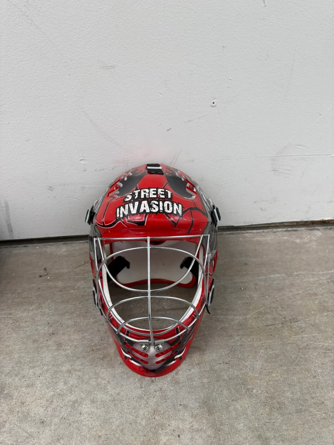 This is a goalie mask with a 'Street Invasion' graphic design. It's a size L. The mask is red with black and silver flame decals. Comes with a metal cage.