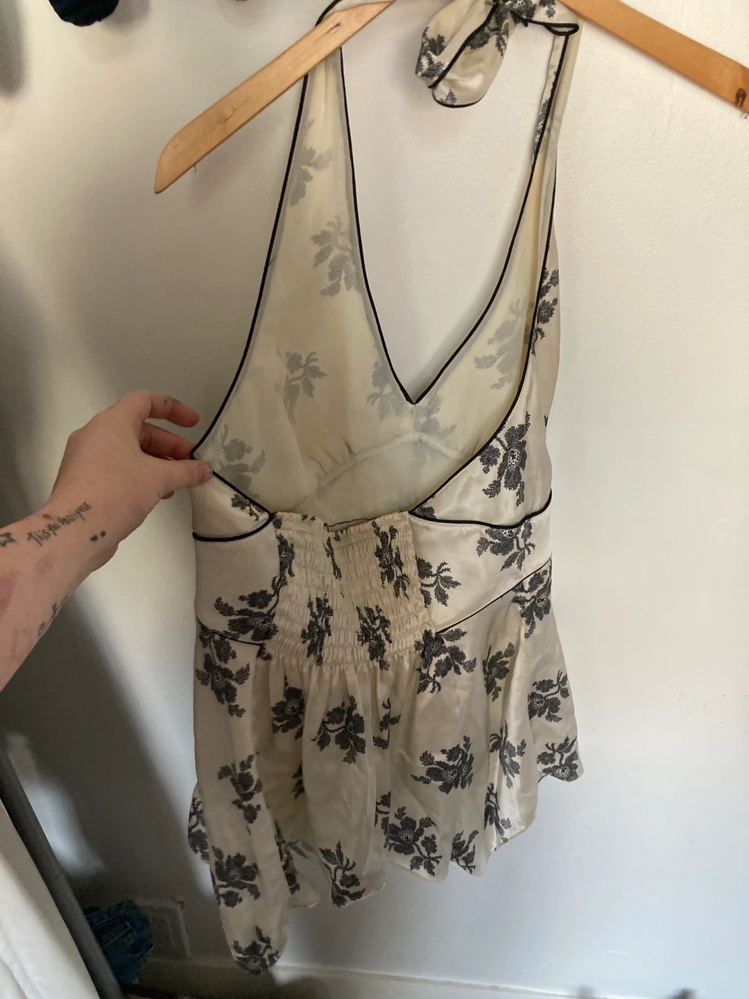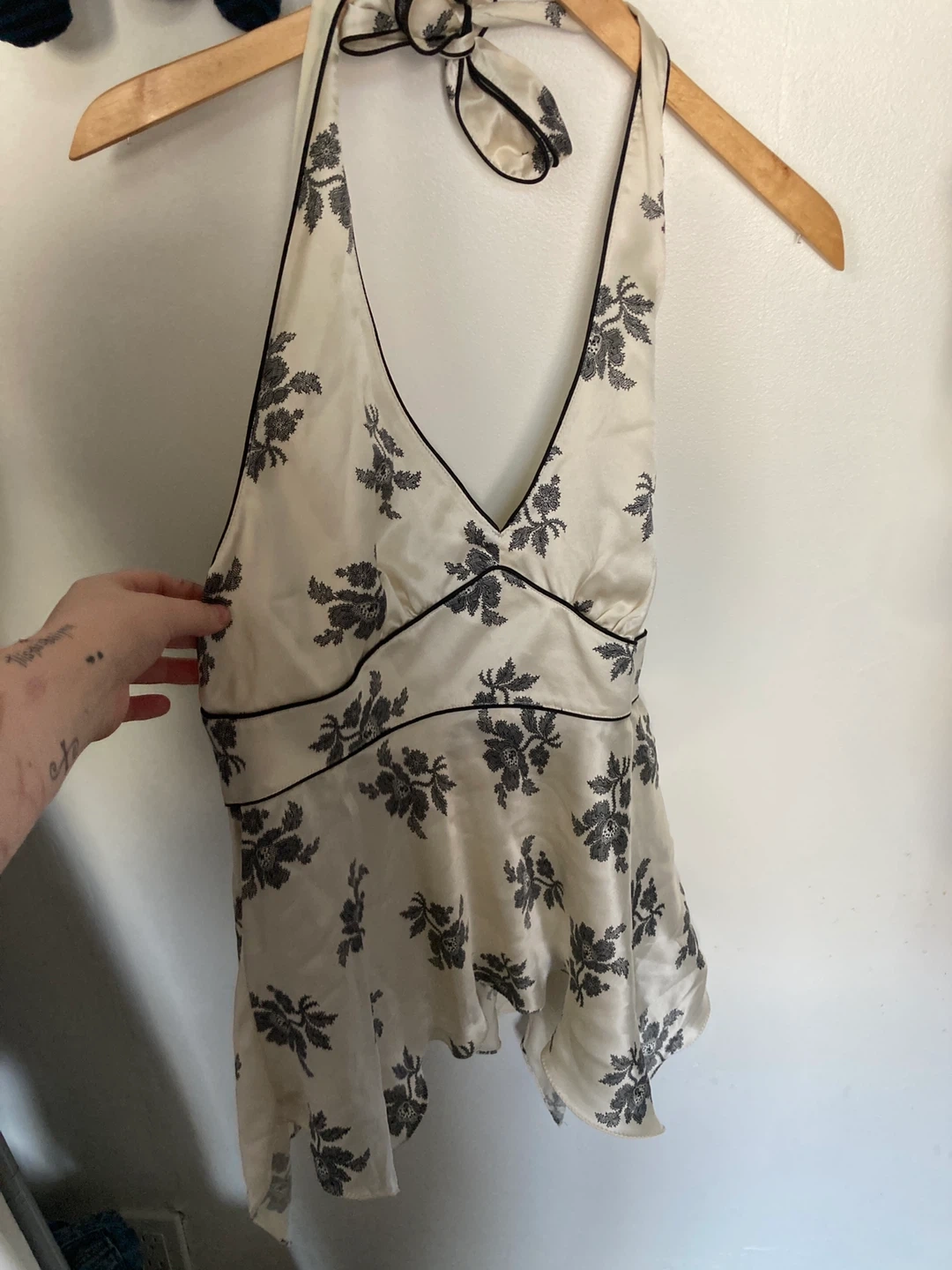 Cute halter top with a floral pattern, perfect for summer! It features a flattering V-neck and a comfortable fit. The material feels lightweight and breezy, great for warm weather. It's in excellent condition and ready for a new home