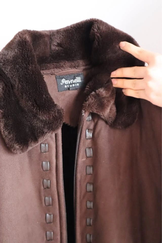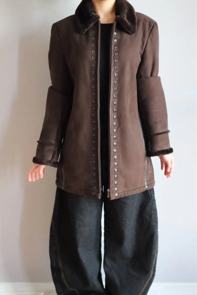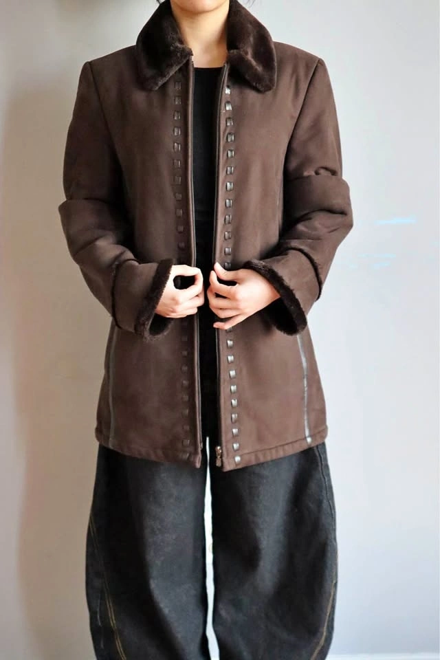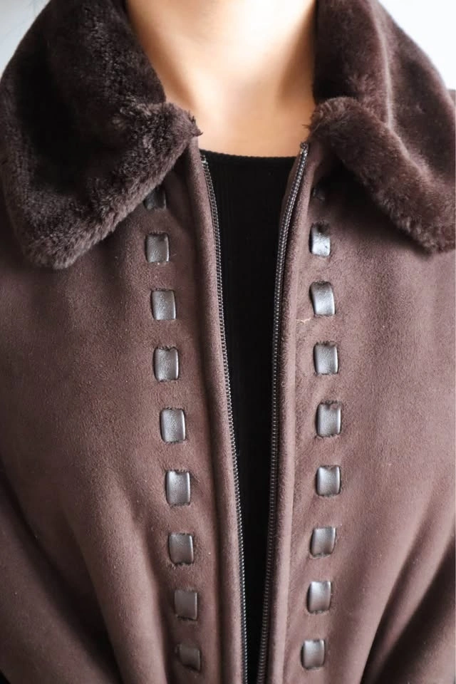 Warm brown jacket with a cozy faux fur collar and cuffs. Zips up. Features cool decorative stitching down the front and sides. Super comfy for chilly days.