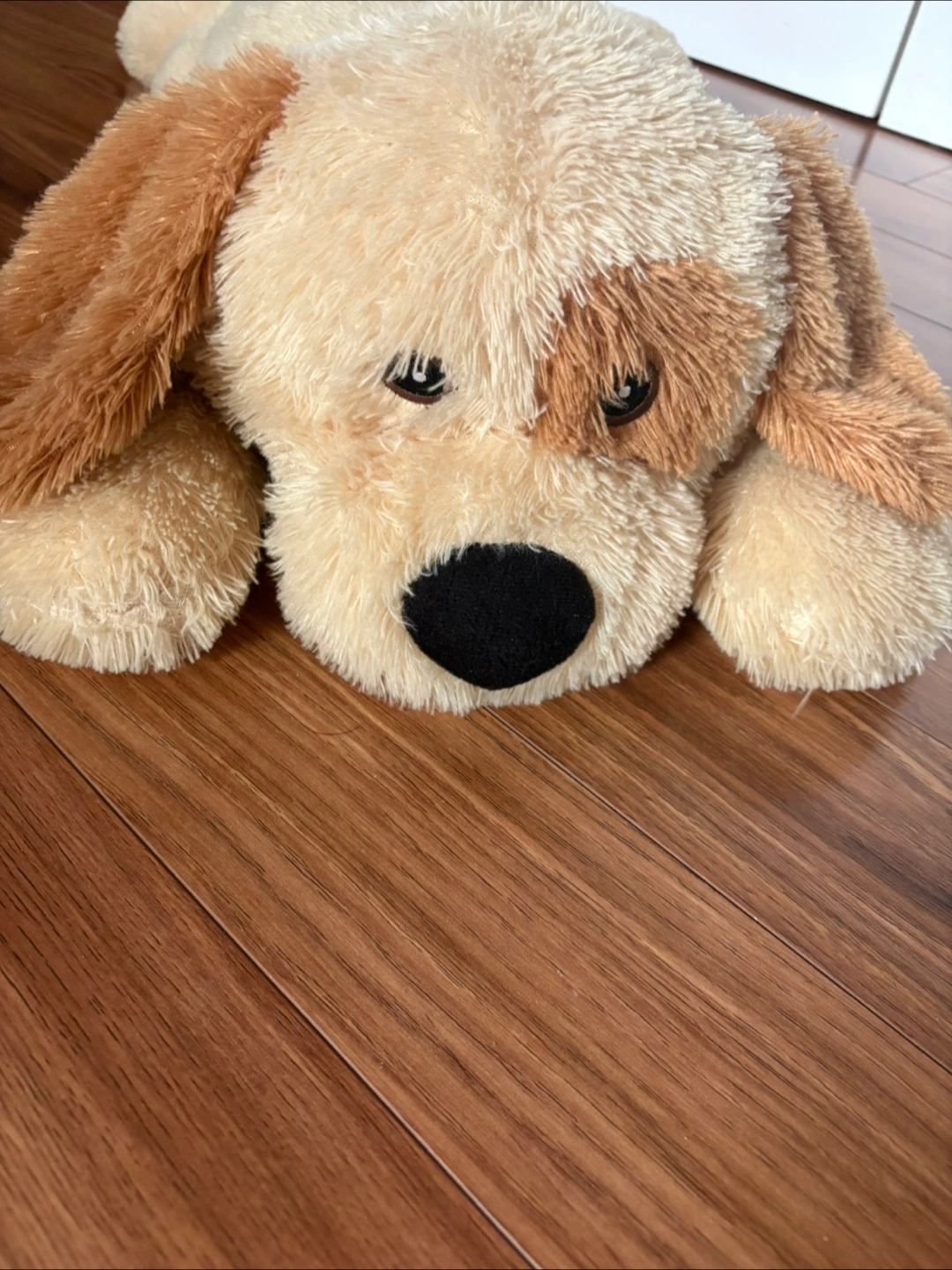 Adorable beige and brown plush dog. Soft and cuddly. Great for kids or collectors. Long and huggable. This adorable large plush dog is ready for a new home! This cuddly canine measures approximately 24 inches long and is in good condition, perfect for snuggling or as a decorative piece. It has been gently loved and is looking for someone to give it lots of affection.