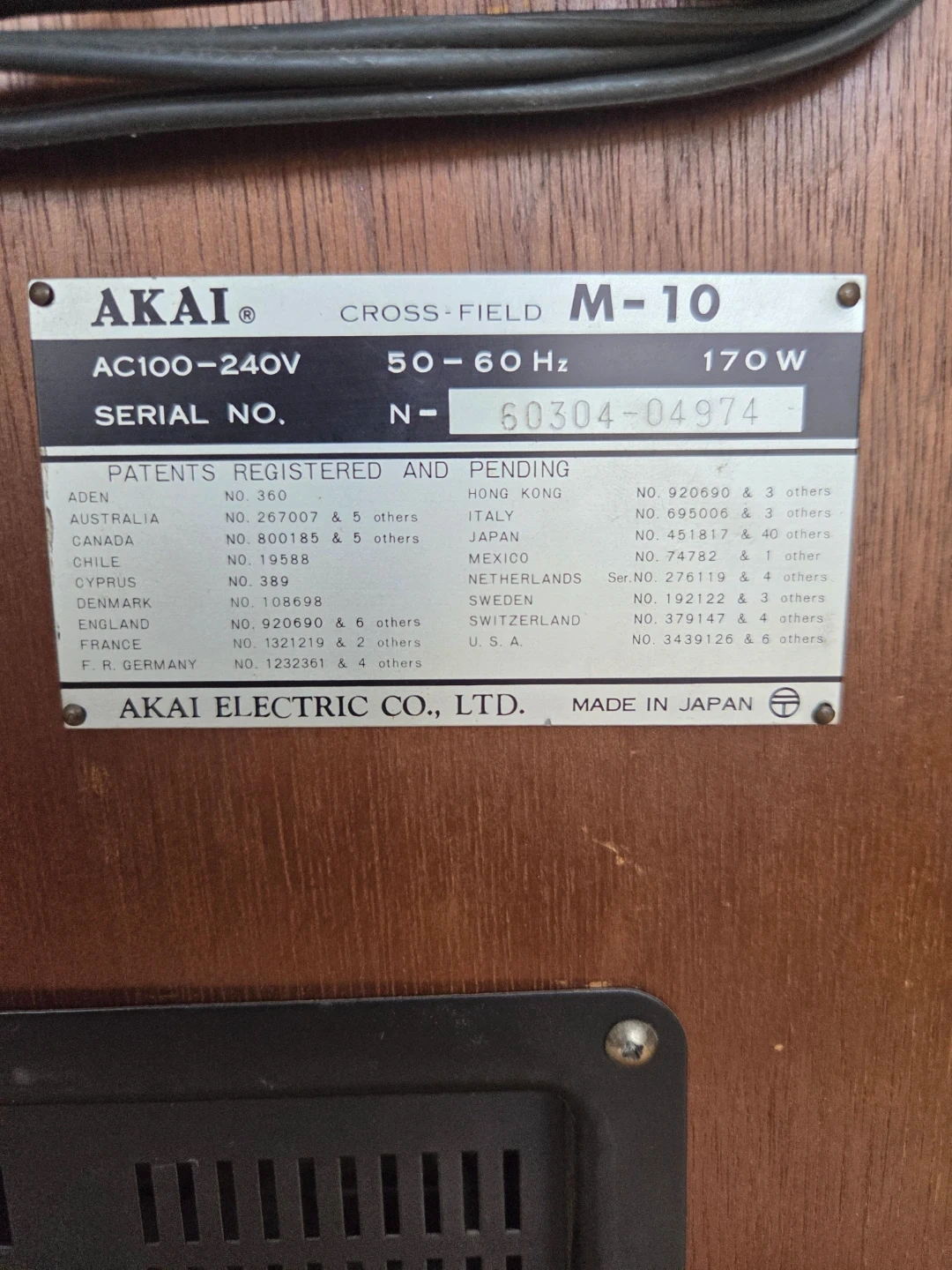 This is an AKAI M-10 reel-to-reel tape recorder. It runs on AC100-240V power and has a 170W consumption. Features include multiple tape speeds and VU meters.