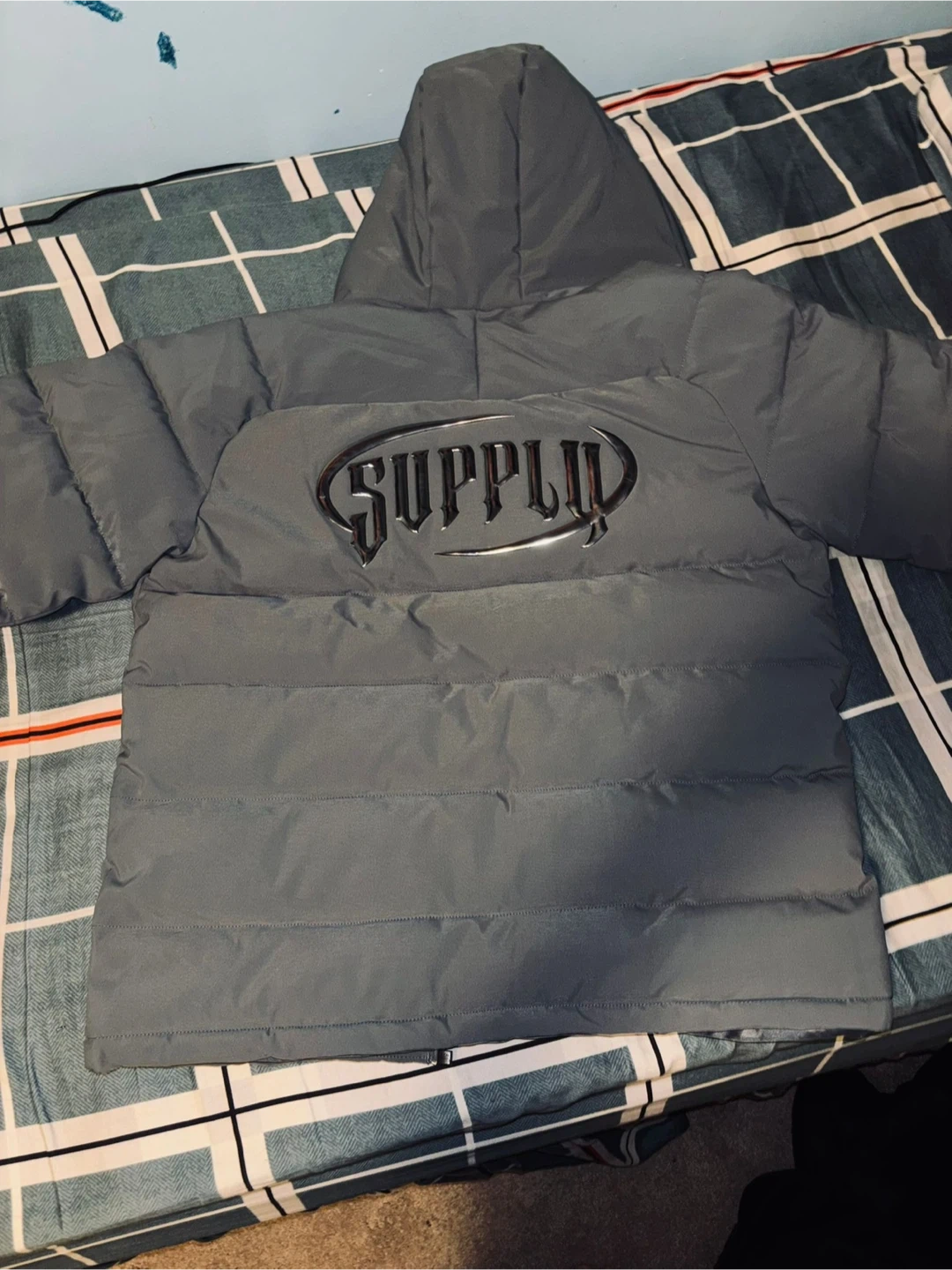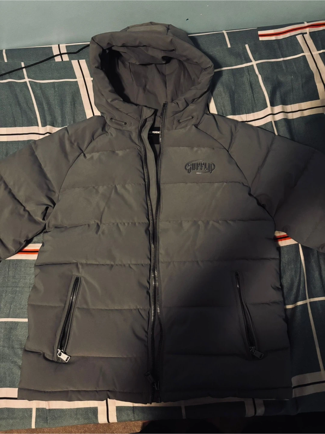 This grey Supply & Demand puffer jacket is a size XL. It features a full zip closure and two front zip pockets. It's a stylish and warm outerwear piece for cooler weather.
