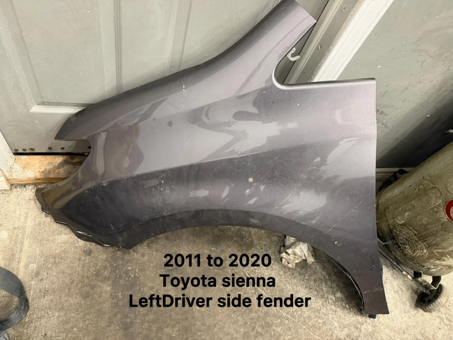 This is a left driver side fender for a Toyota Sienna. It fits models from 2011 to 2020. The colour appears to be a dark grey metallic.