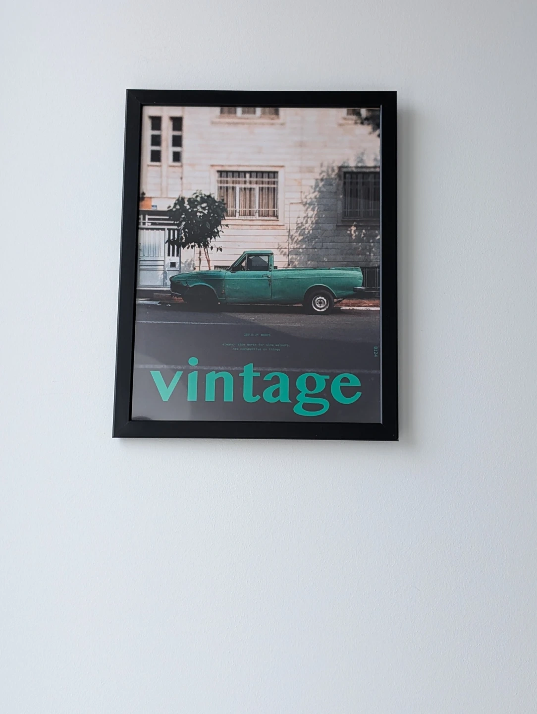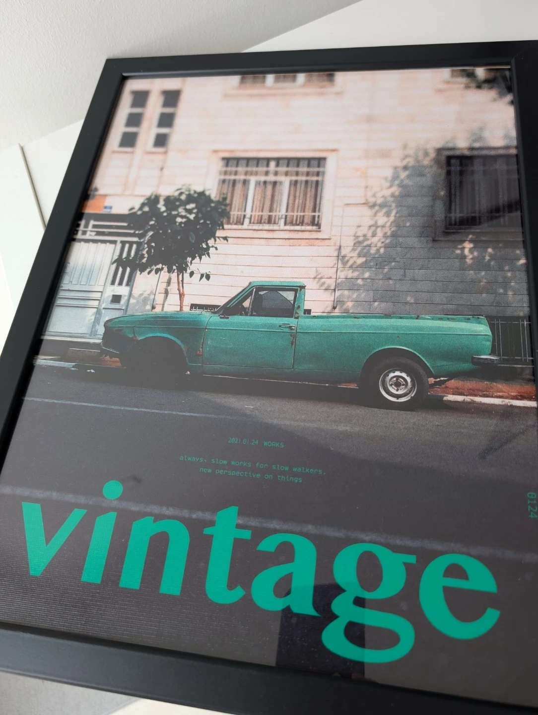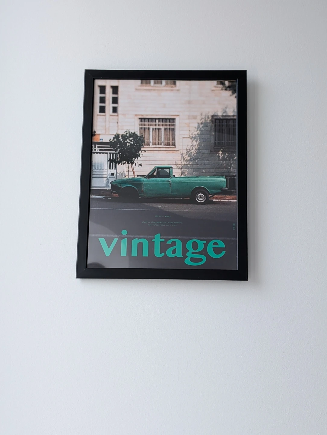 Framed print featuring a vintage green truck. "vintage" text is displayed prominently. Includes a smaller text block with "always, slow works for slow walkers, new perspective on things."