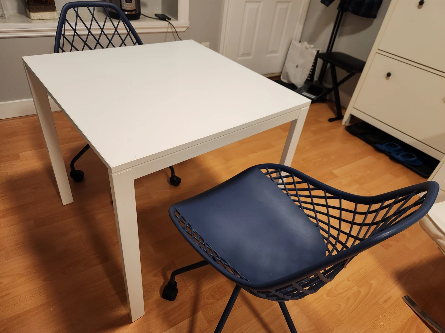 White square dining table with two blue swivel chairs. Chairs have a diamond pattern back and are on wheels. Great for a small kitchen or dining nook!