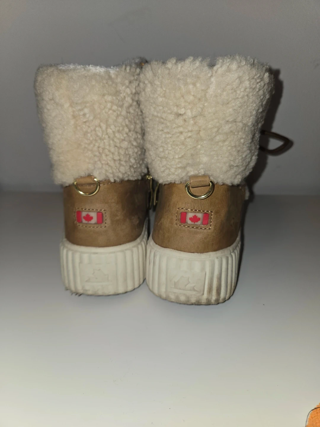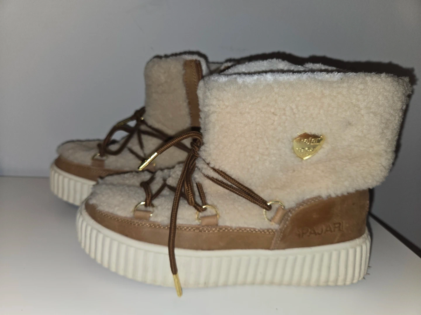 Cozy beige Pajar winter boots with shearling lining and tan suede accents. Featuring lace-up fronts and side zippers for easy wear. These boots are waterproof and perfect for keeping warm in colder weather!