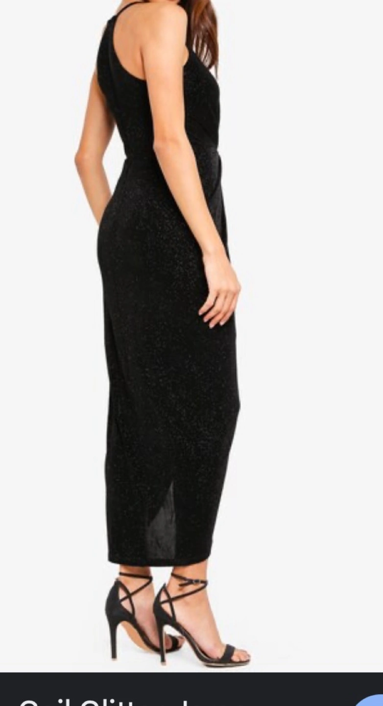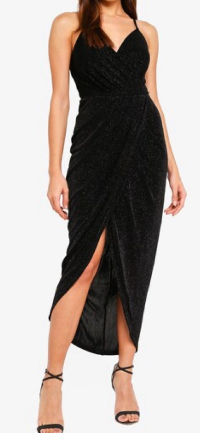 Black sparkly /glitter dress, great for a special occasion. V-neck, spaghetti straps, wrap style. High slit. Size small.
