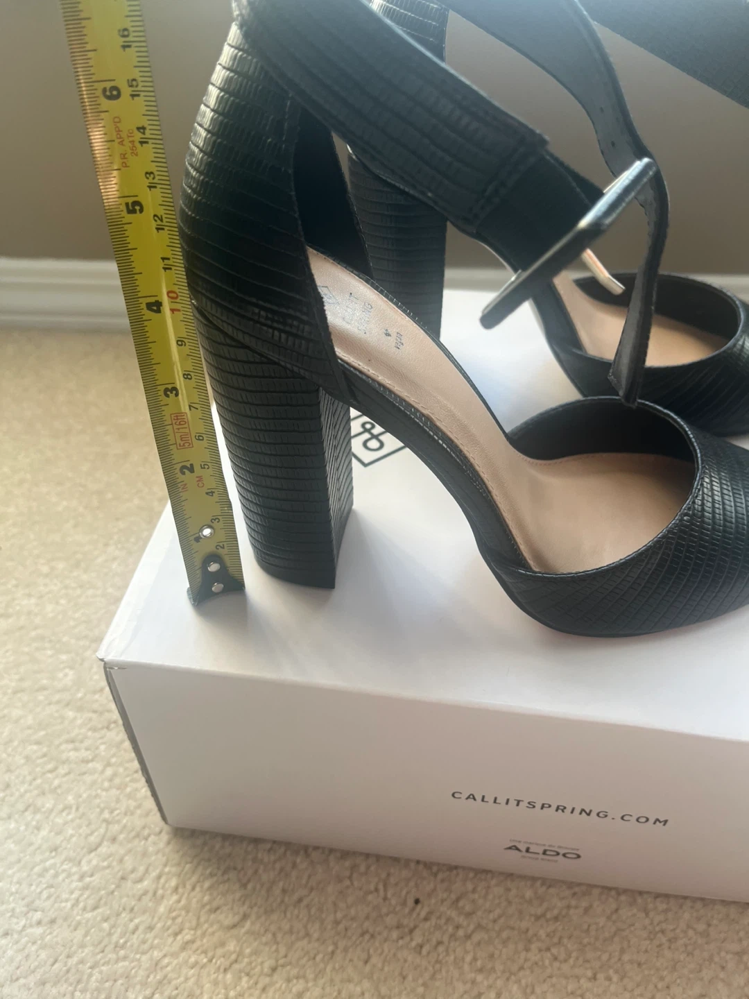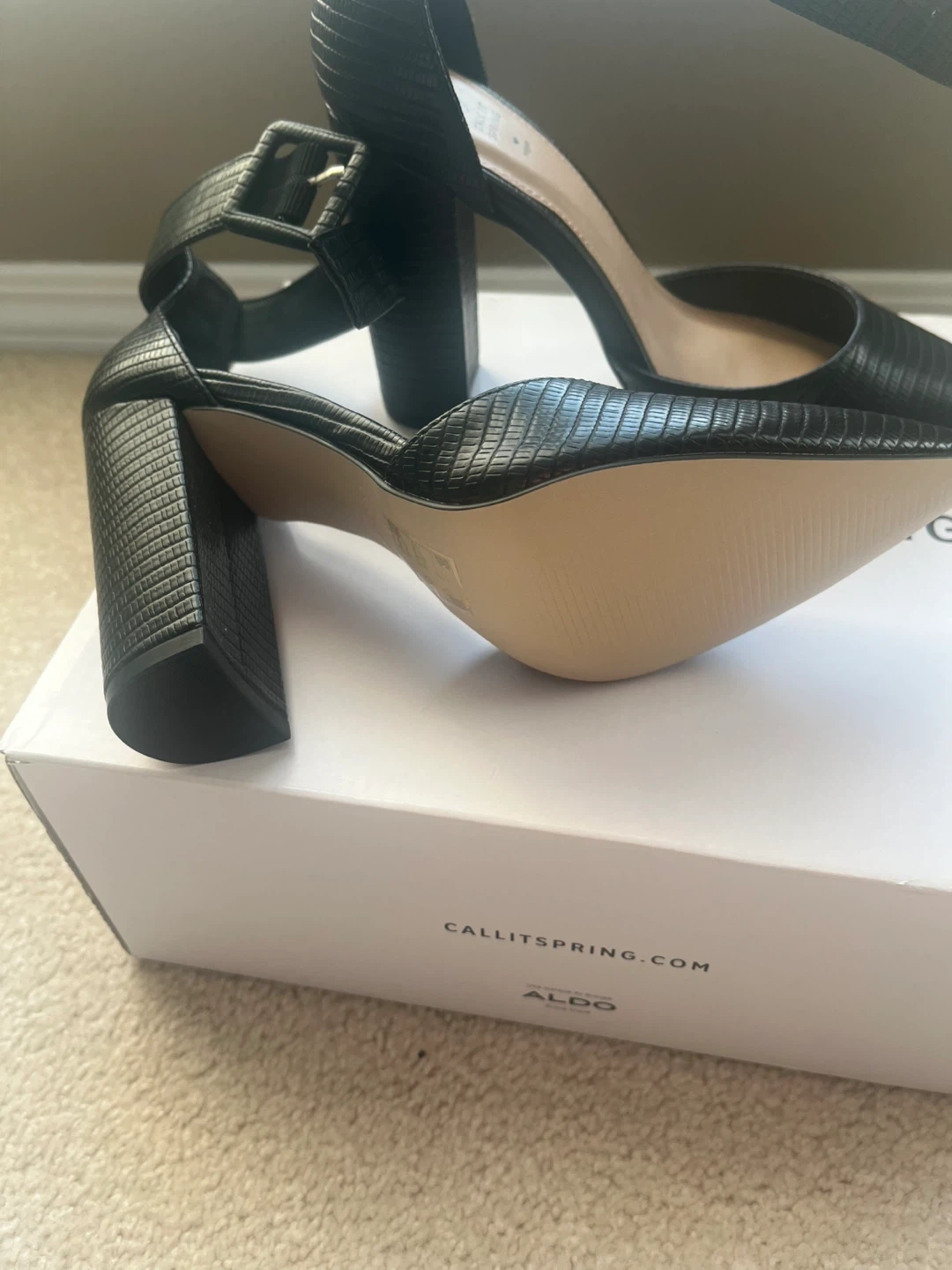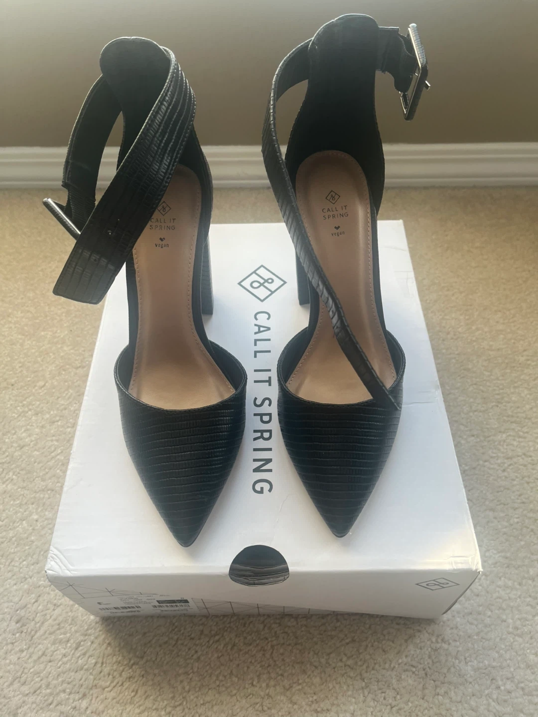 Black Faux Lizard heels from Call It Spring. These feature a pointed toe and ankle strap with a buckle closure. The heel height is approximately 4 inches. Perfect for dressing up any outfit! Brand new.
