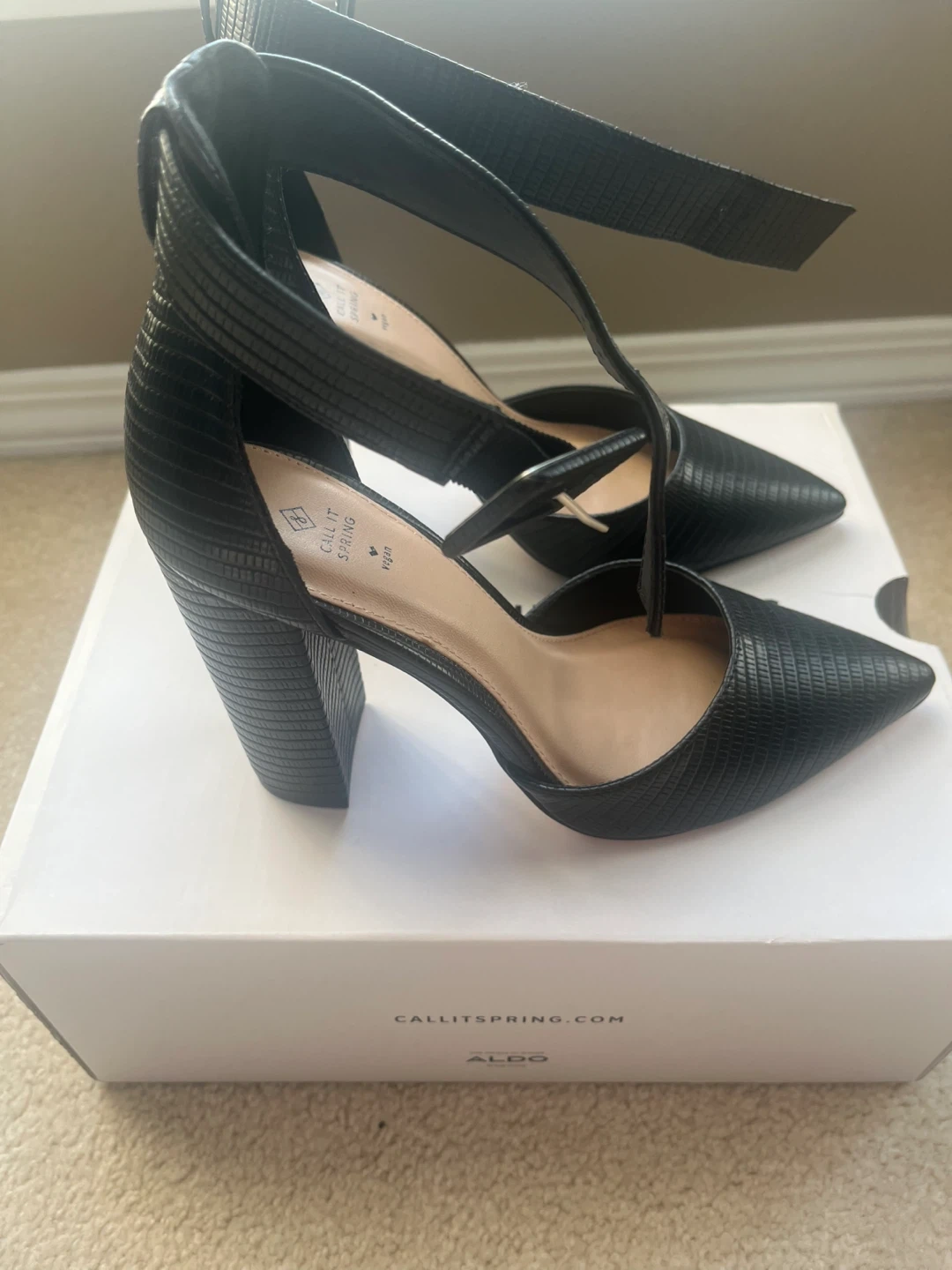 Black Faux Lizard heels from Call It Spring. These feature a pointed toe and ankle strap with a buckle closure. The heel height is approximately 4 inches. Perfect for dressing up any outfit! Brand new.
