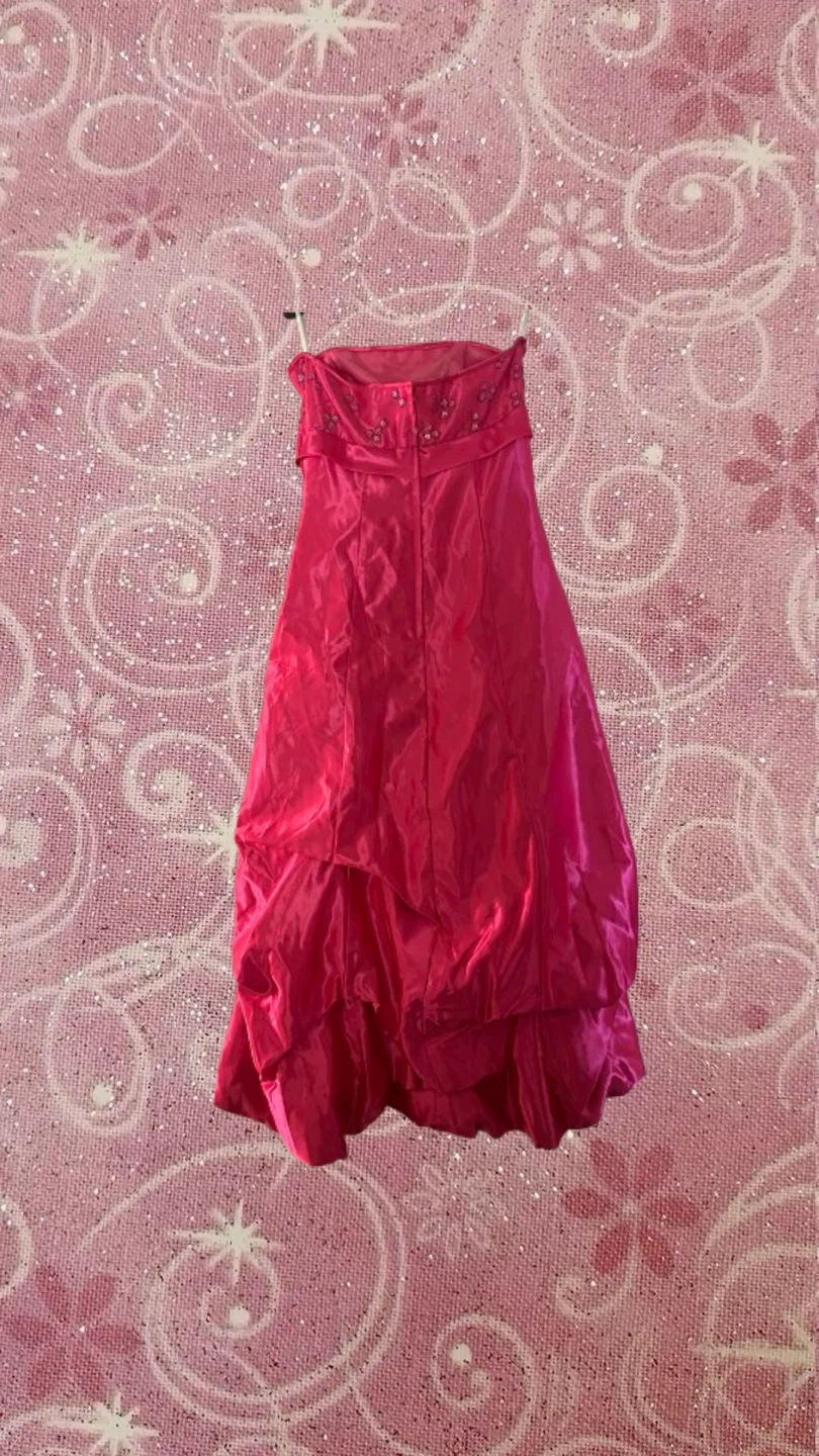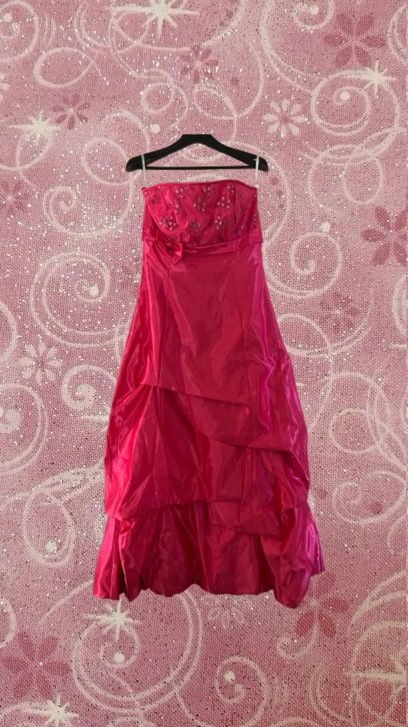 A strapless formal dress in a vibrant fuchsia colour. It features a beaded bodice with a sweetheart neckline and a ruched, layered skirt. This dress is perfect for special occasions or prom!