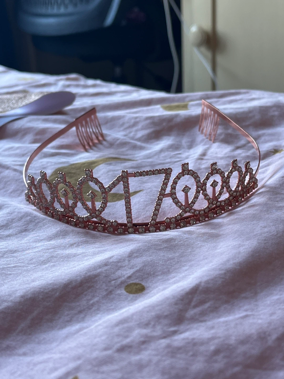 Sparkly gold sash and a rose gold tiara with '17' detailing. Perfect for a 17th birthday celebration. This set includes a decorative sash and a tiara to complete the festive look.