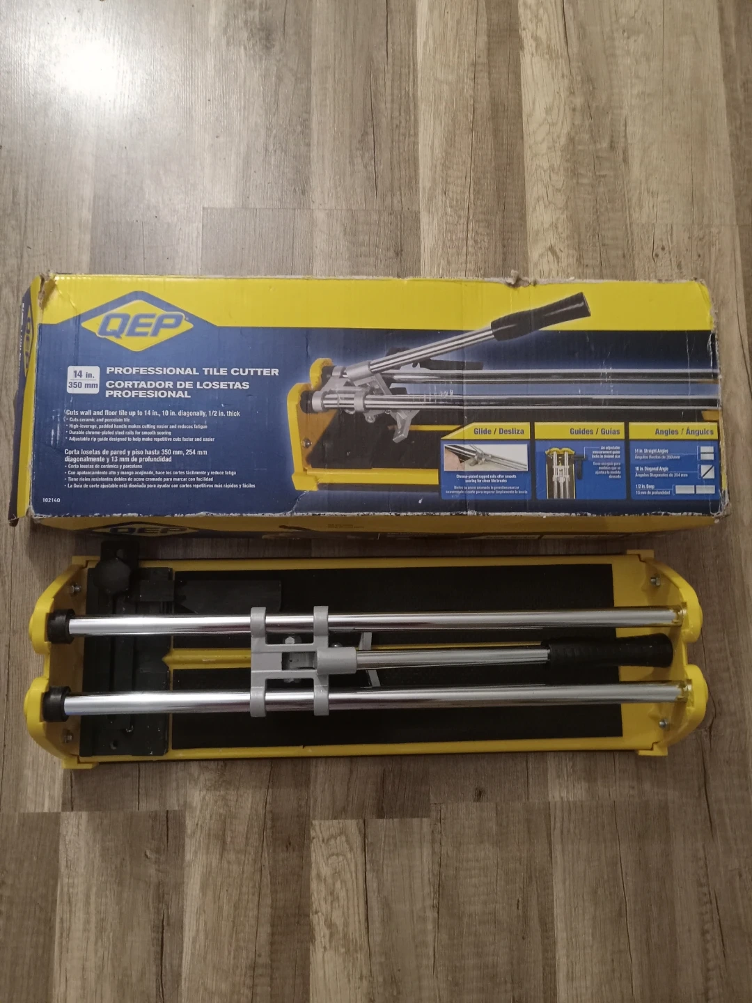 0Selling a QEP 14-inch professional tile cutter. It can cut wall and floor tile up to 14 inches, or 10 inches diagonally, and is suitable for tiles up to 1/2 inch thick. It's designed to cut ceramic and porcelain tile, with a high-leverage, padded handle to make cutting easier. The durable chrome-plated steel rails ensure smooth scoring, and the adjustable rip guide helps with repetitive cuts. Comes with the original box