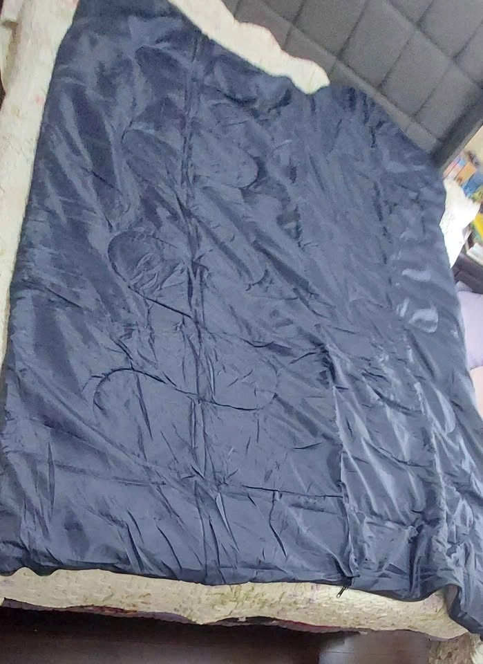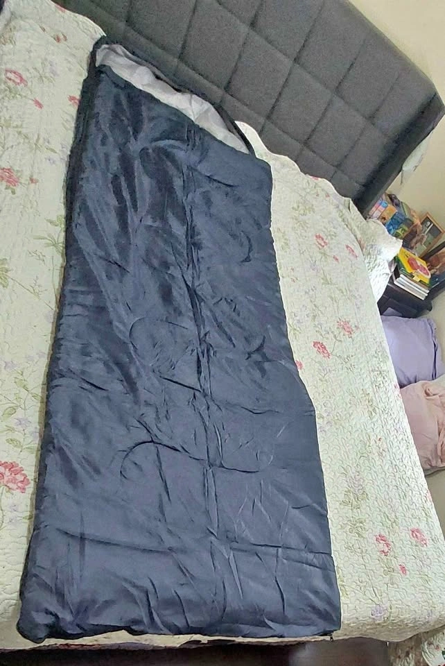 Like new sleeping bag, bought as a spare and never used. Includes compression bag. Photos taken on queen-size 6'x6.5' bed. Bought from Amazon for $30 new. Surface material is 230T polyester with hollow cotton filler. Measures 190cm x 150cm with a separated bottom zipper. Package size is 37cm x 27cm. It is quite lightweight and withstands weather from 5℃ to 35℃.