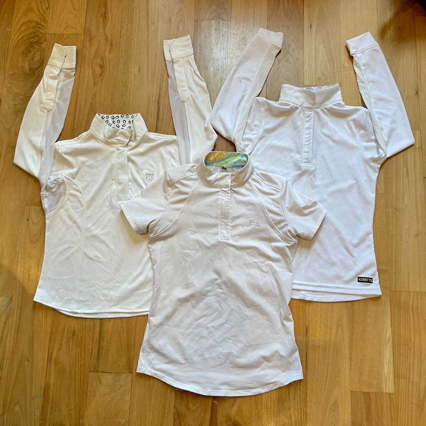 Selling three youth riding tops, all in White size Medium (8-10 yrs). Brands include RJ Classics, Elation Platinum, and Kerrits. All in good condition and ready for a new home!