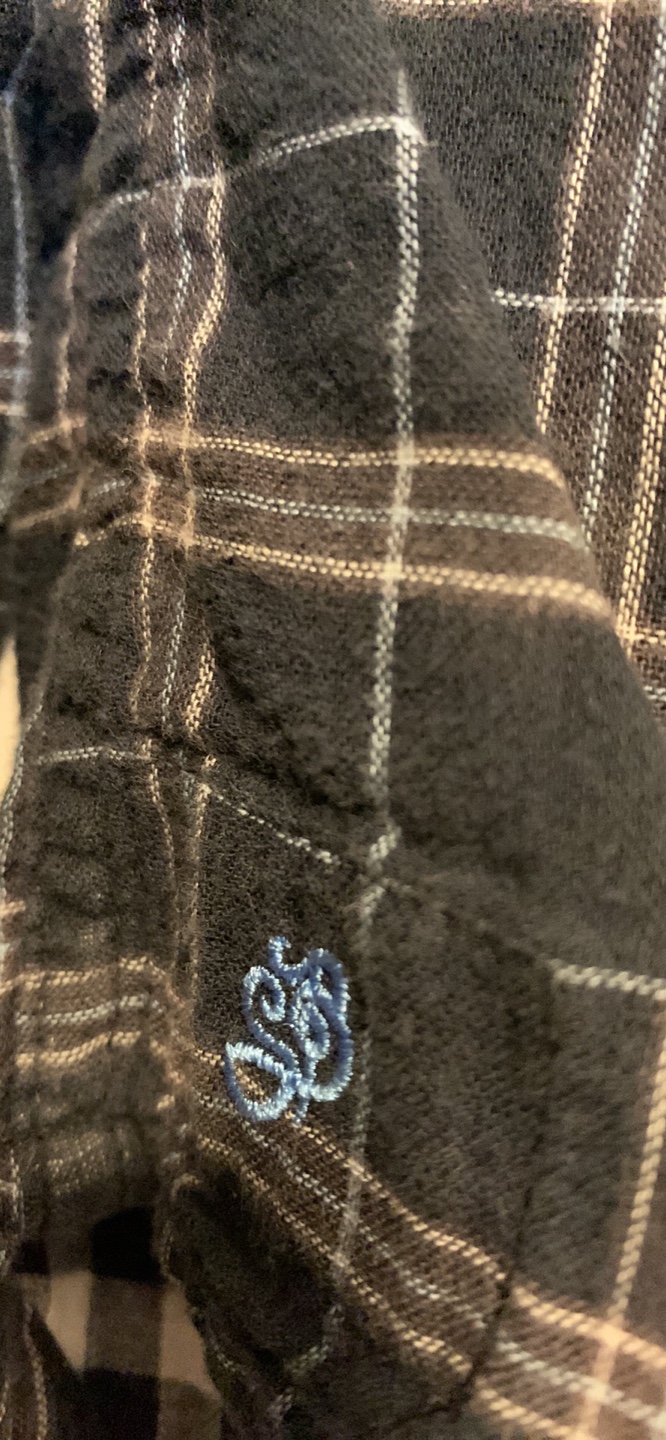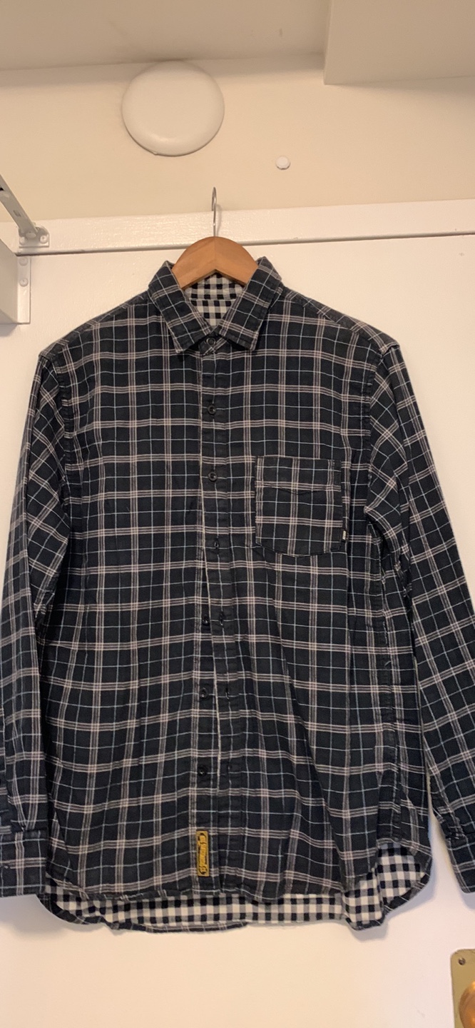 plaid flannel shirt with a unique design. It features a classic plaid pattern in black, brown, and white. The shirt has a button-down front, a chest pocket, and long sleeves. The inner lining is a black and white checkered pattern.