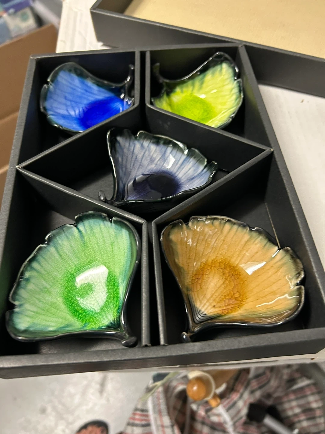 Set of 5 unique ginkgo leaf shaped dishes. Includes blue, green, blue-grey, lime green, and amber colors. Perfect for serving small appetizers or as decorative accents!