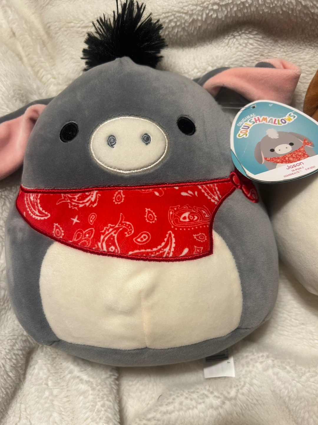 Selling two adorable Squishmallows plushies! There's Jason, the grey donkey with a red bandana, and Com, the cute calico cat. Both are new with original tags