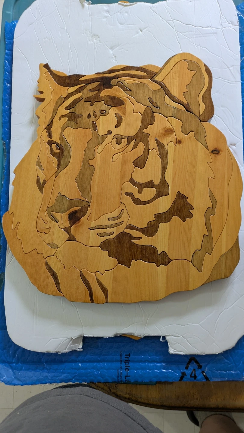 This is a unique wooden art piece featuring a tiger's head. It's crafted from various shades of wood to create a detailed image. This piece would look great on a wall! Semi gloss finish, hardboard backer....14 3/4" W x 15 1/2" H x 7/8" D