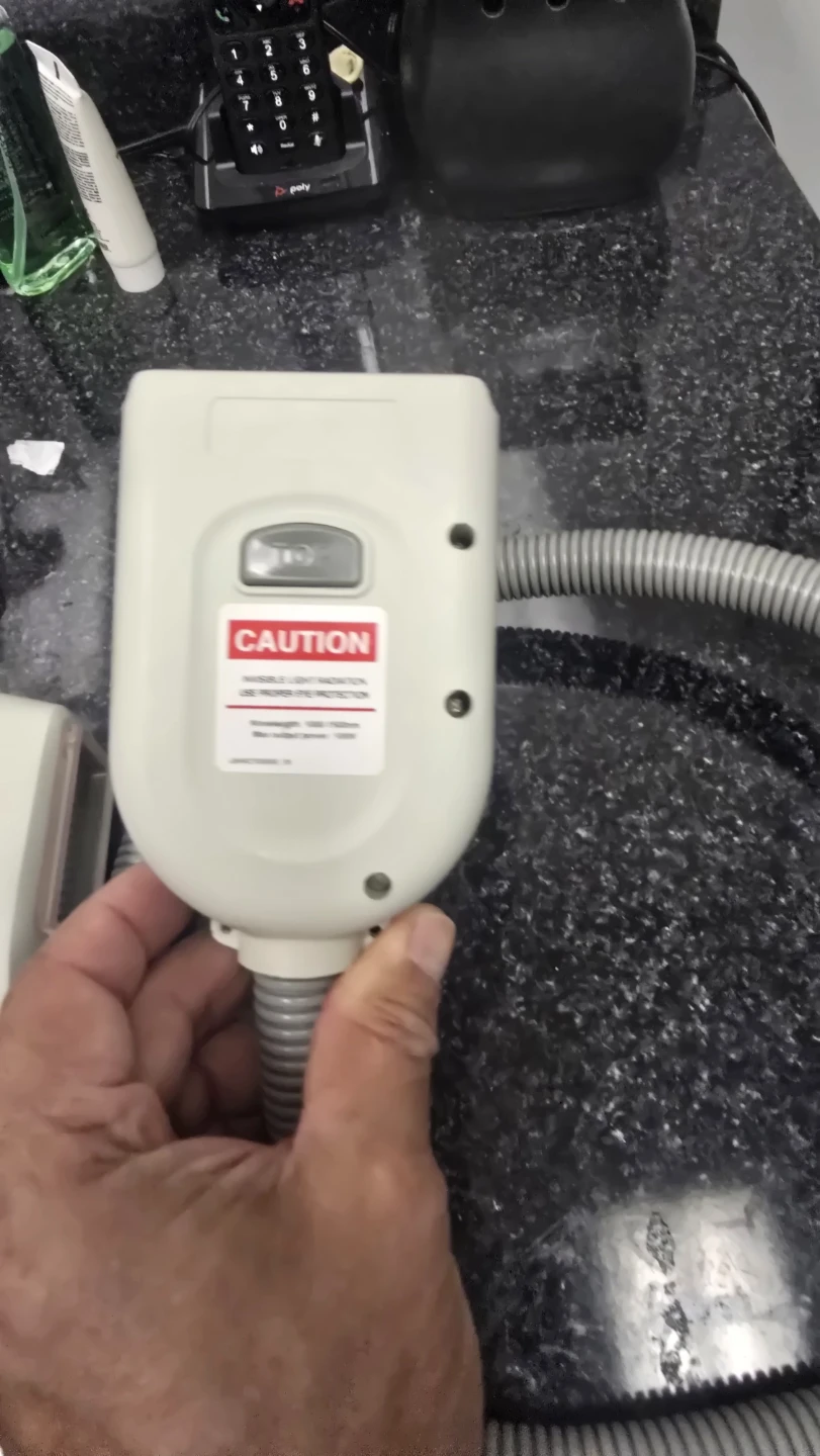 This is a handpiece for an Alma laser system. It's connected via a grey hose and has a caution label regarding proper eye protection. Ideal for professional aesthetic treatments.