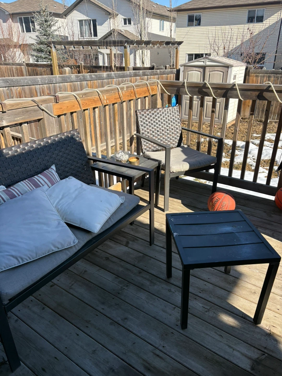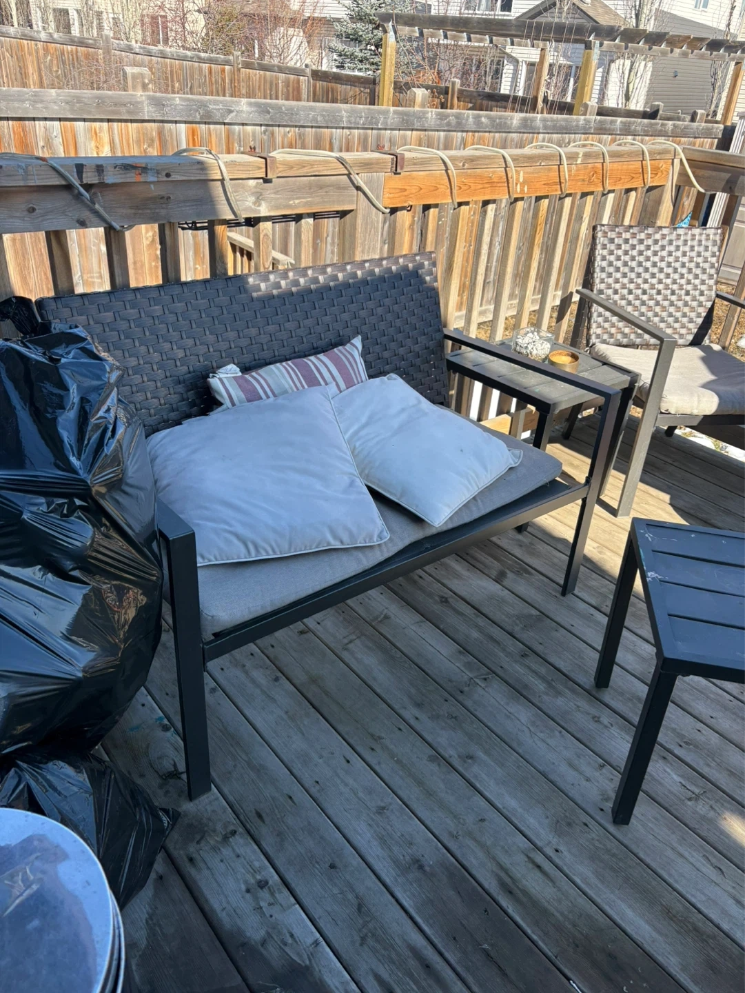 This patio furniture set includes a loveseat and two chairs, perfect for enjoying your outdoor space. The set features a durable metal frame with a wicker-like finish on the loveseat. Cushions are included for added comfort. Metal side tables are also part of the set.