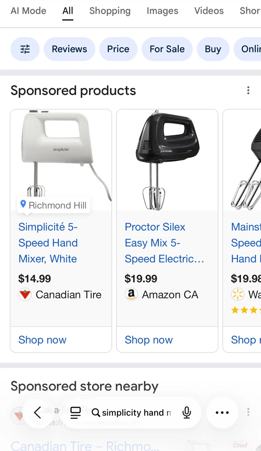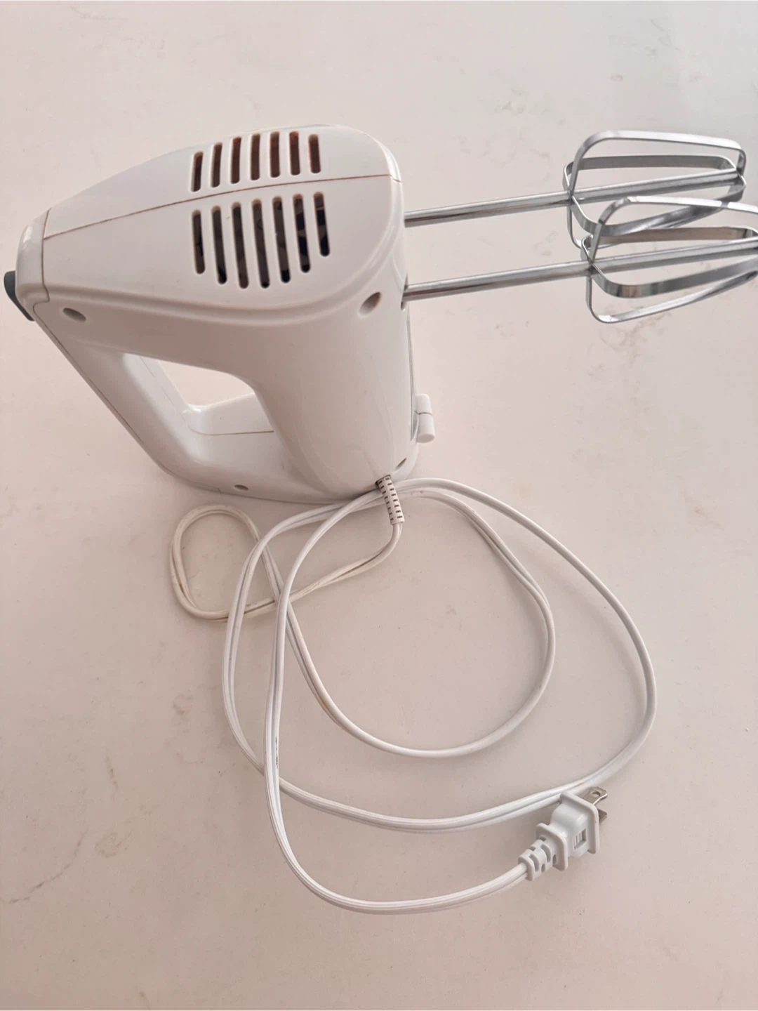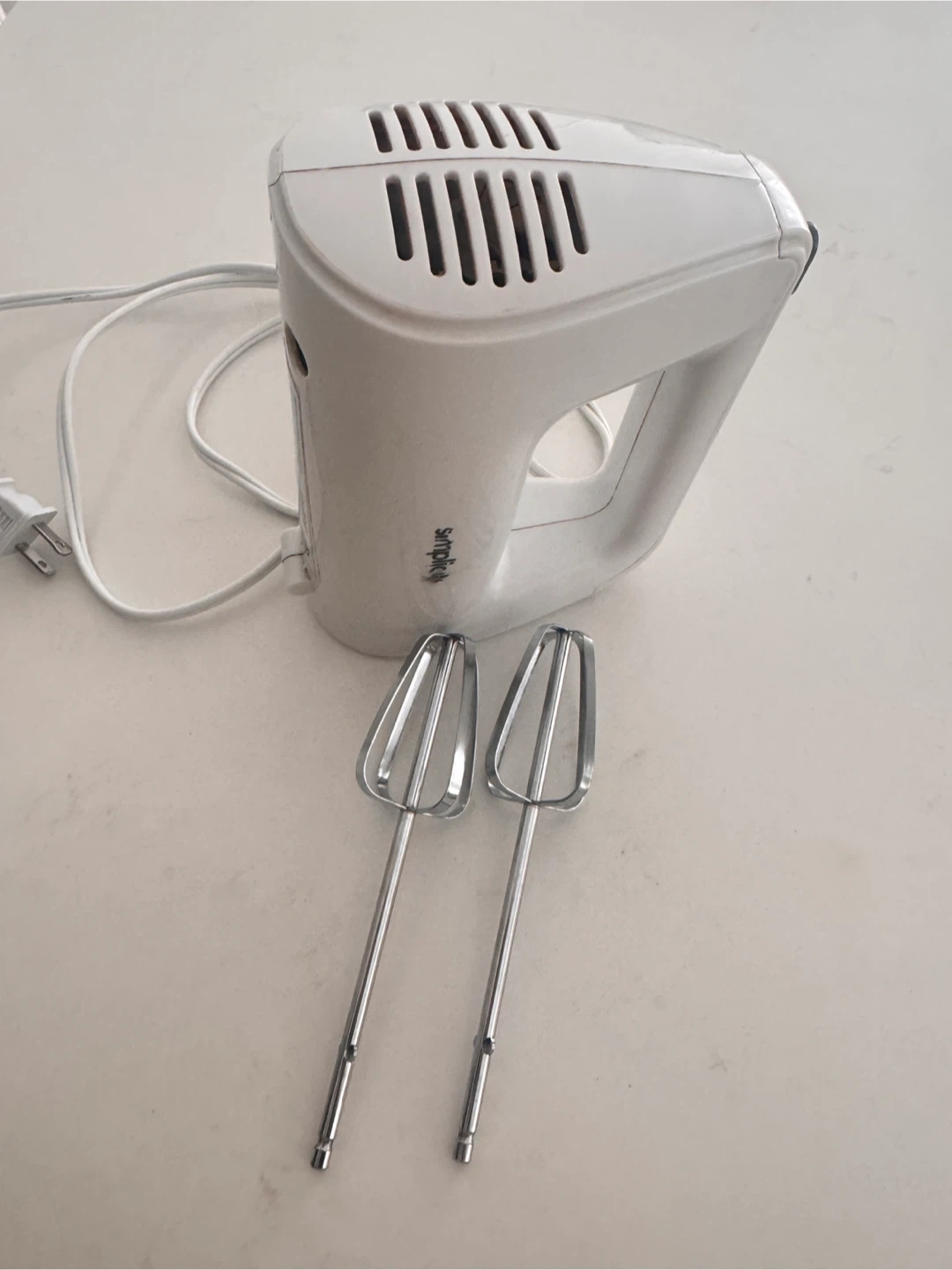 This is a white Simplicity brand hand mixer. It comes with two metal beaters for mixing and whipping. The mixer has a 5-speed setting with a power button.