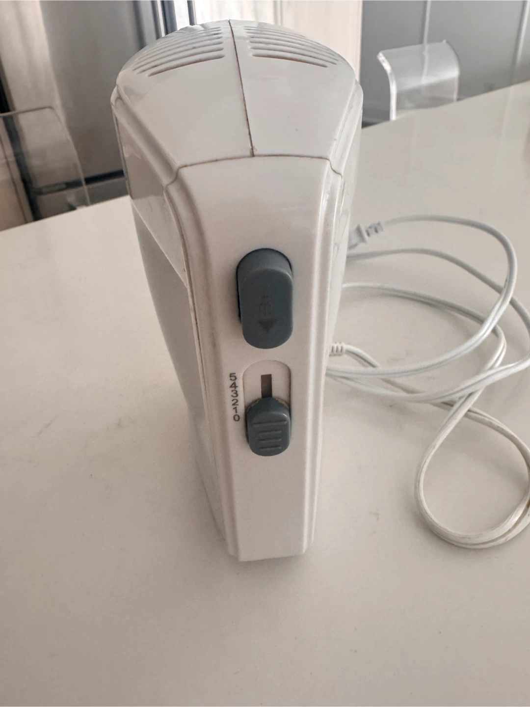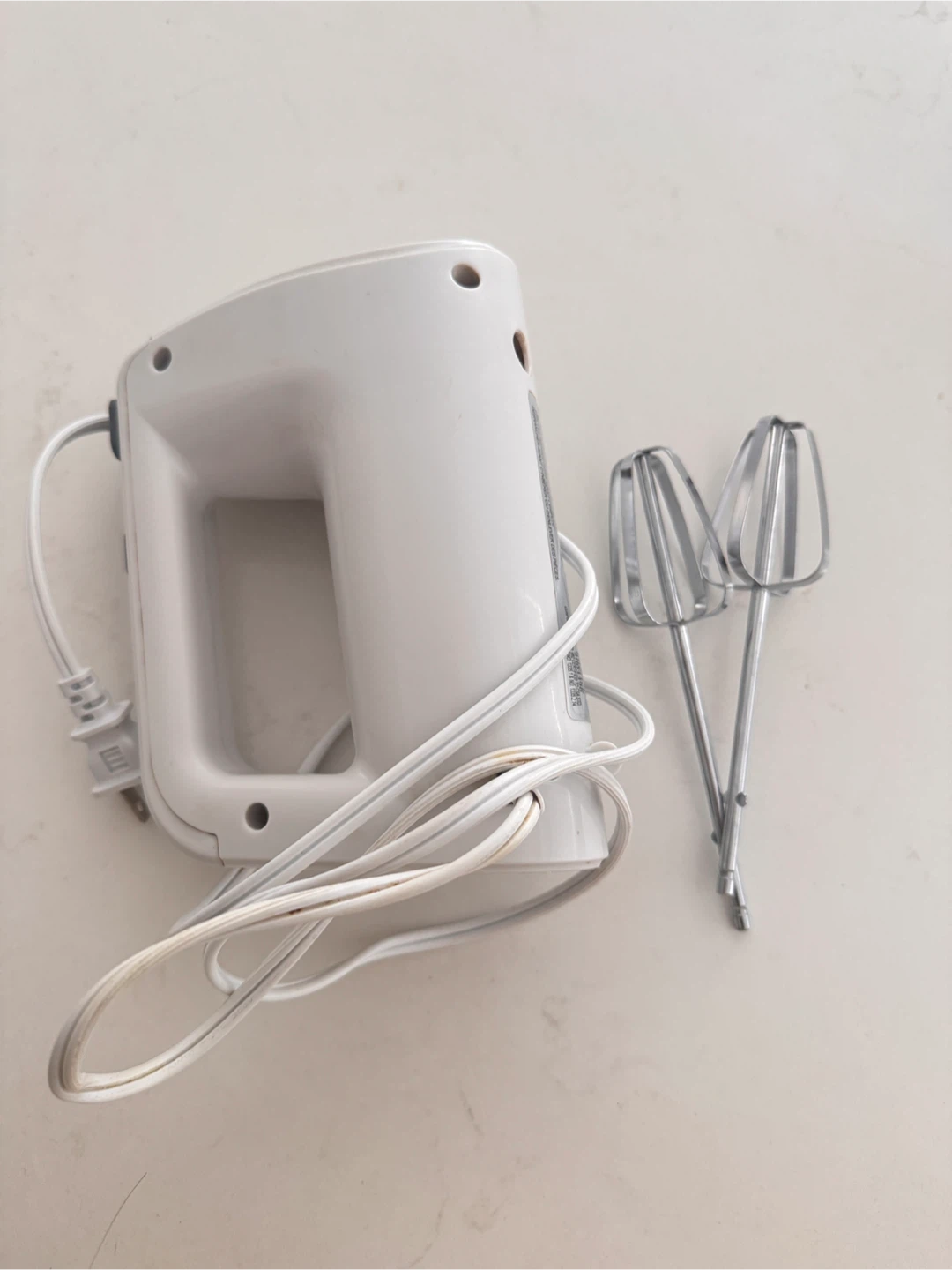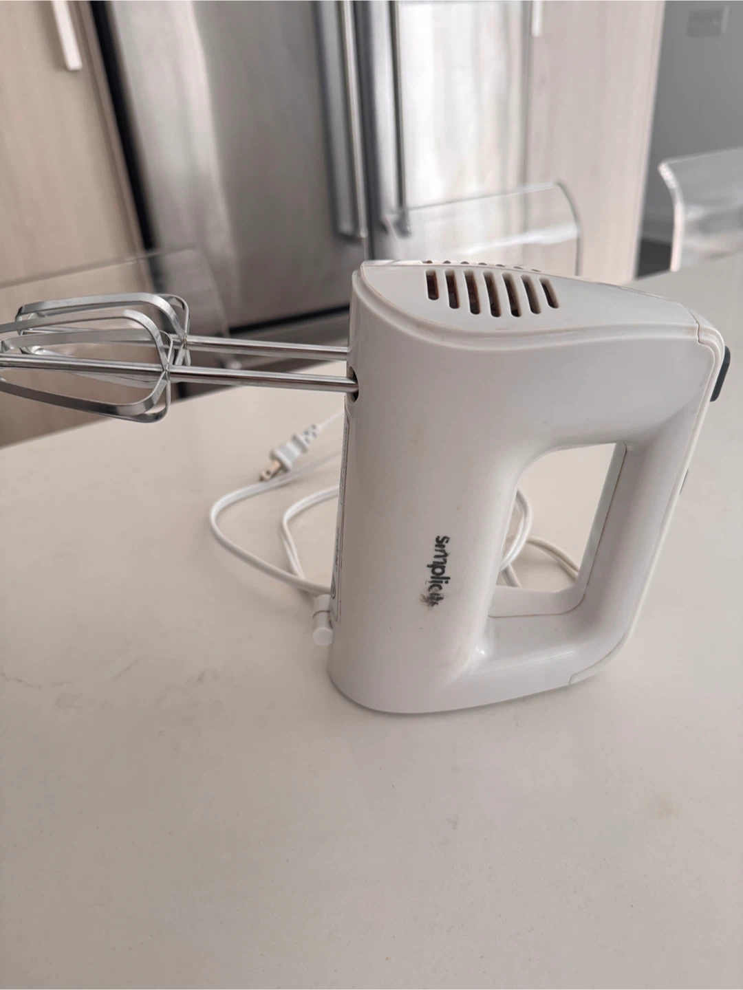 This is a white Simplicity brand hand mixer. It comes with two metal beaters for mixing and whipping. The mixer has a 5-speed setting with a power button.