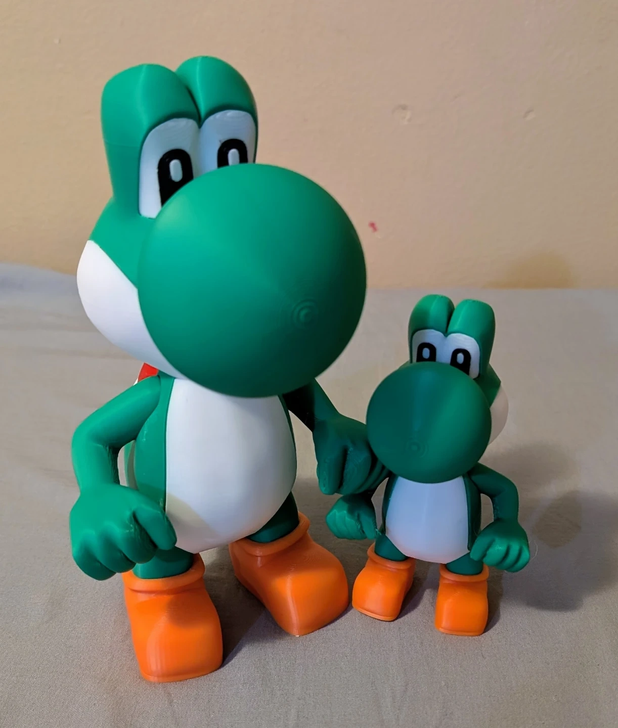 These are two Yoshi figurines from the Nintendo Video Game Super Mario series. They are 3D Printed. One full size (25cm tall) and one small size (15cm tall). They're great collectibles for any Mario fan! All for $5.