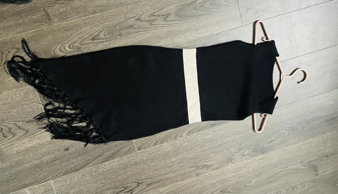 This black scarf features a stylish white stripe down the centre and a fringed hemline. It's made from a soft, comfortable material. It's perfect for adding a touch of flair to any outfit!