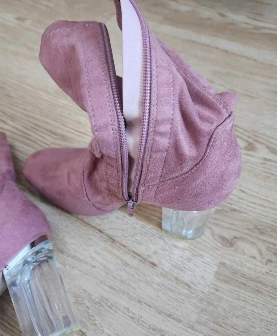 Pink ankle boots with a faux suede finish and a trendy clear block heel. They feature a side zipper for easy wear. Perfect for adding a stylish touch to your outfits!